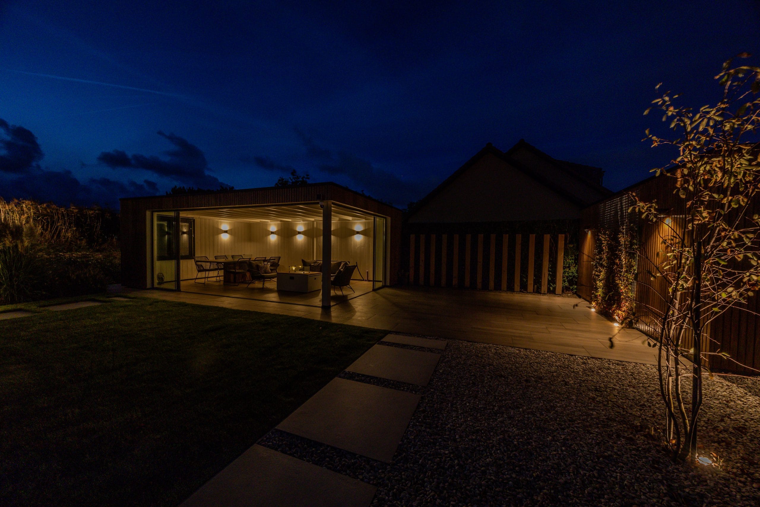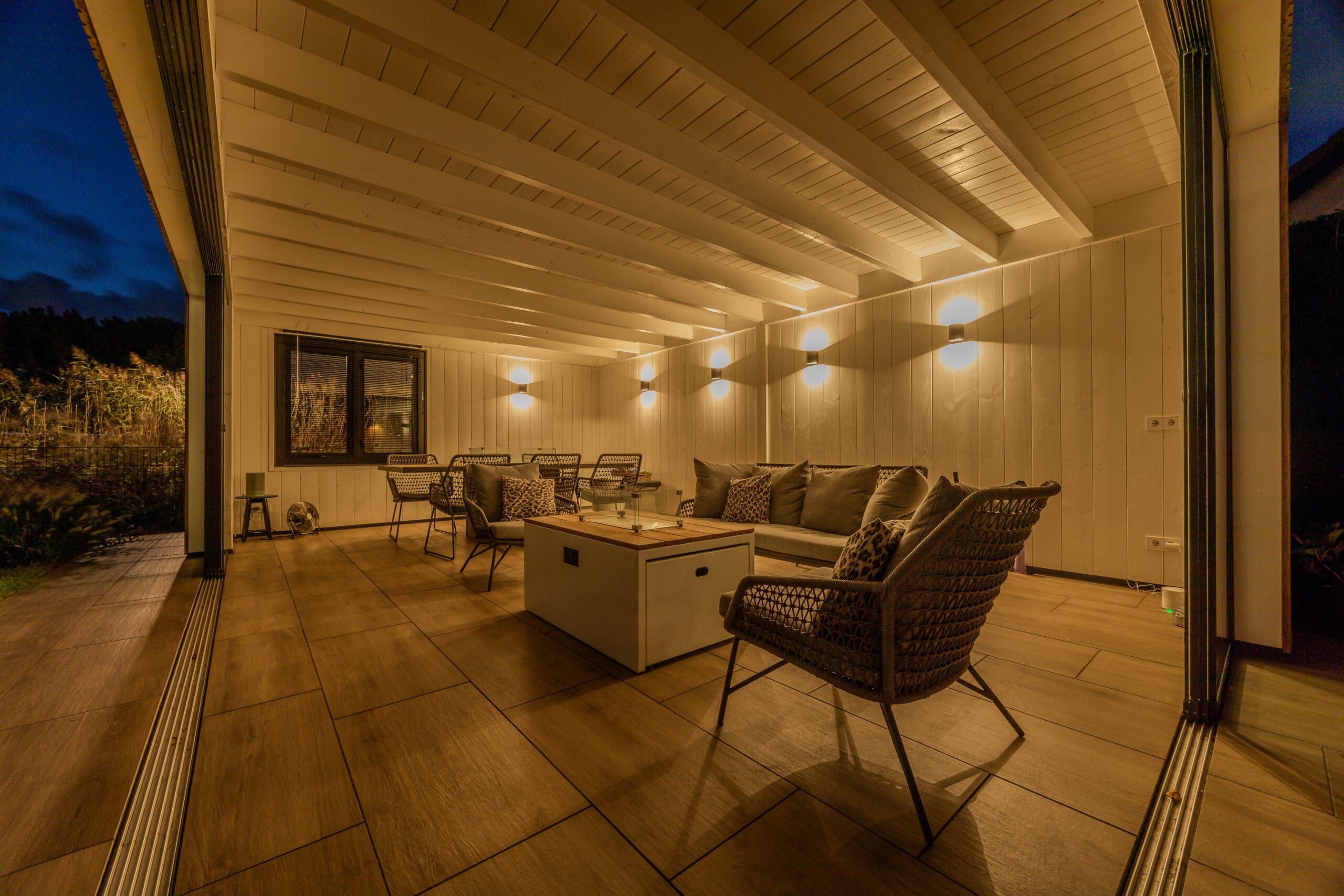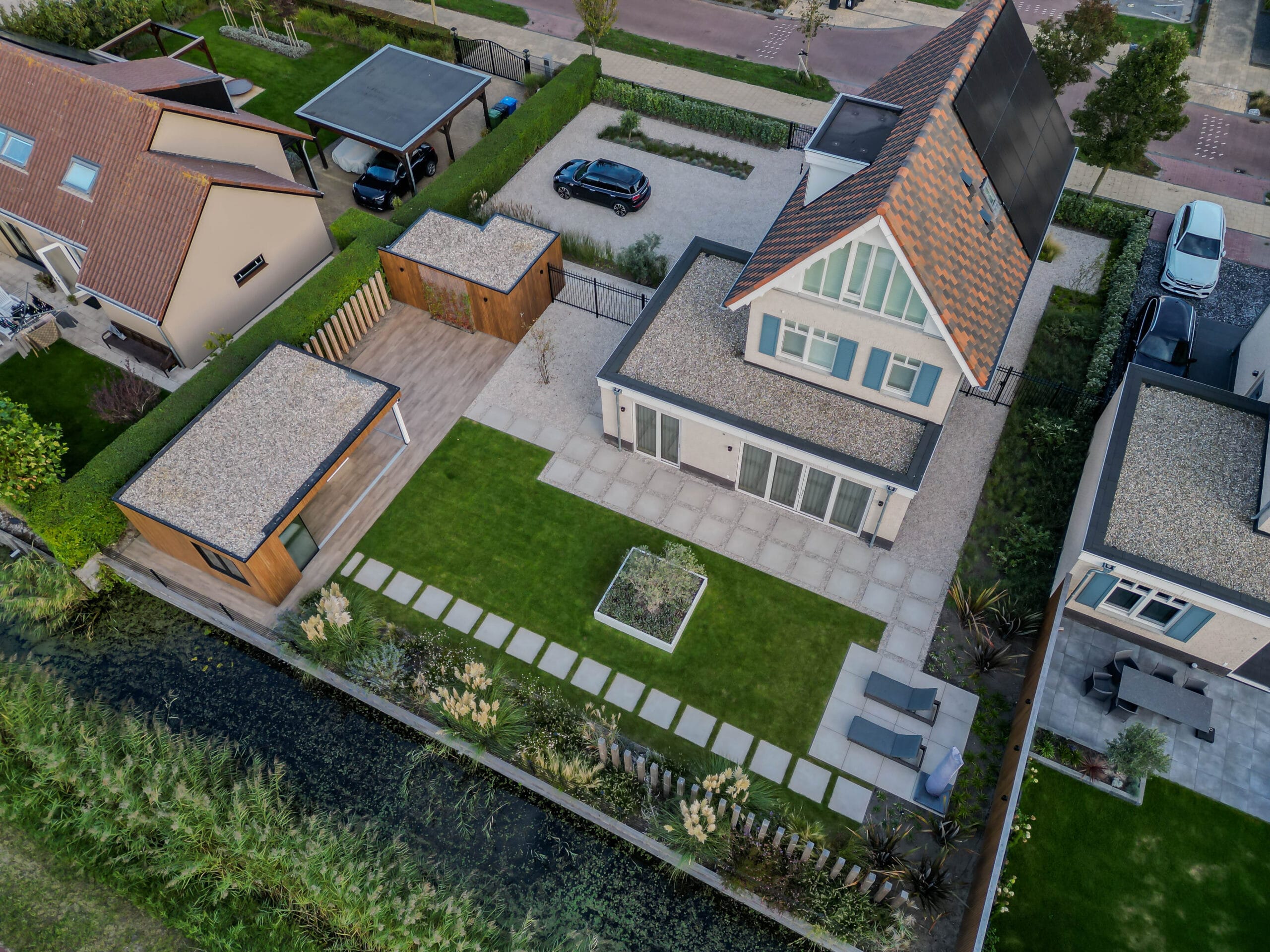 De combinatie van hout, keramiek en groen vormt de basis van deze tuin. De veranda is uitgevoerd in warm Douglas en voorzien van glazen schuifdeuren voor optimaal gebruik het hele jaar door. De schuur sluit qua stijl naadloos aan op de rest van de tuin. De Ayous Rhombus schutting geeft een moderne, natuurlijke uitstraling en wordt versterkt door de In-lite verlichting. De damwand zorgt voor stabiliteit en een nette afwerking aan het water.