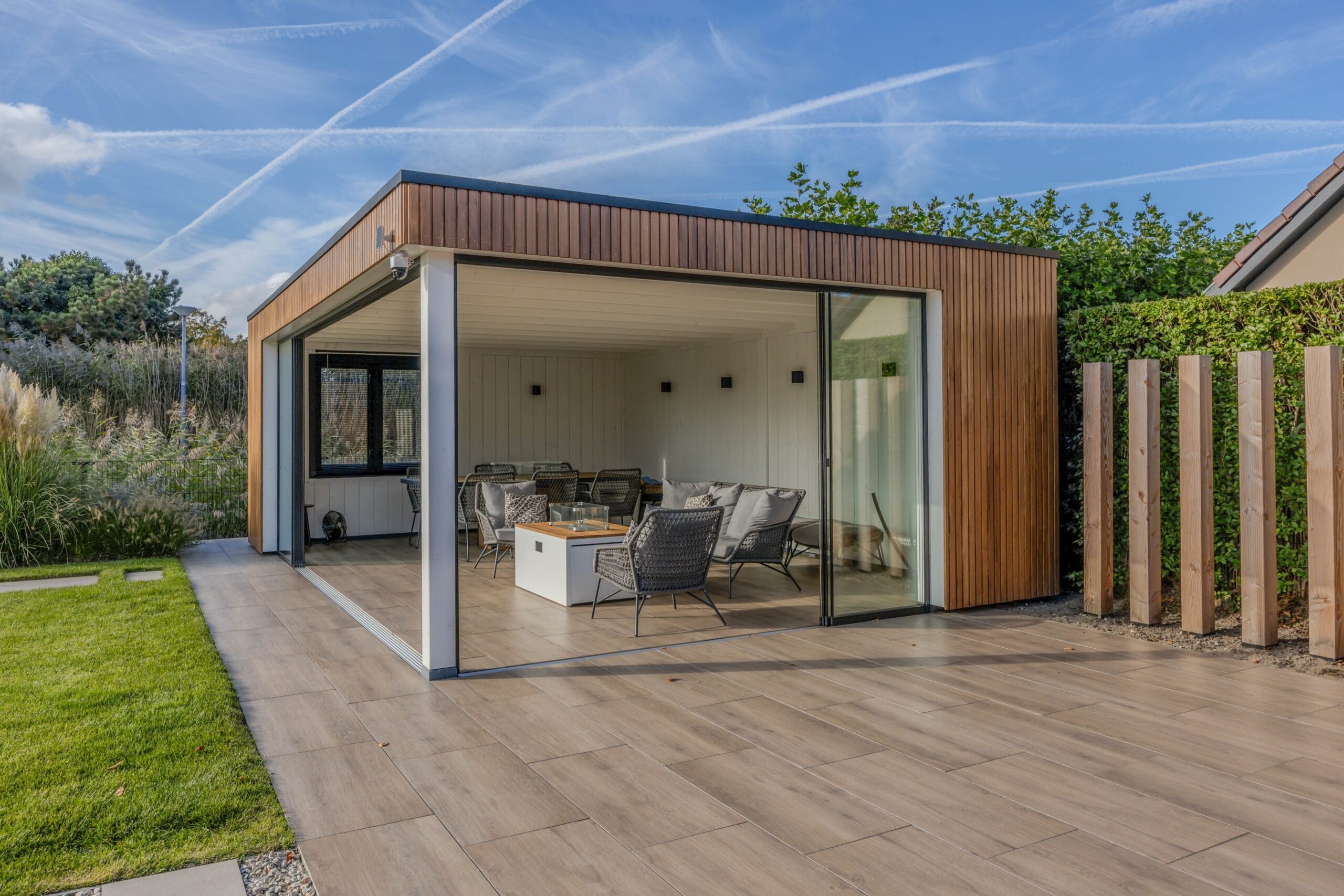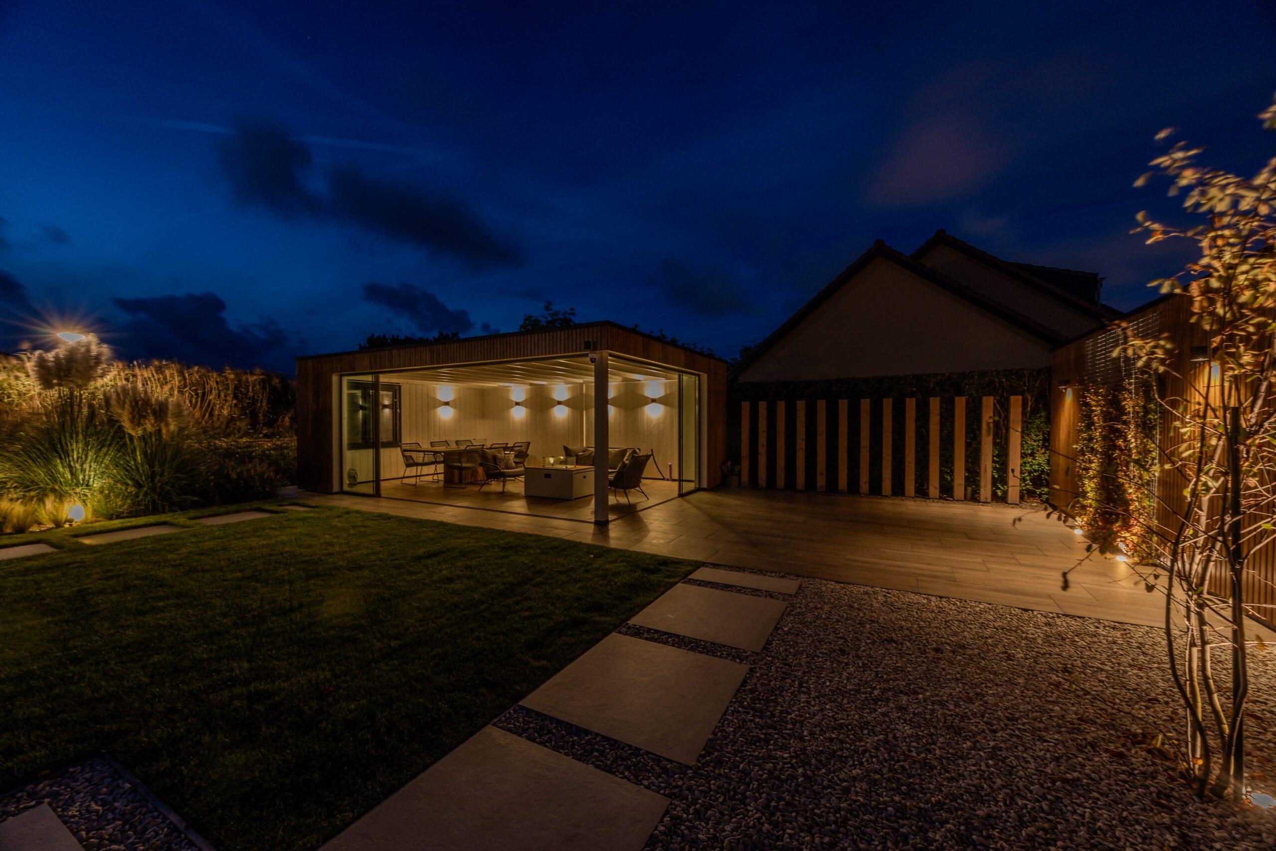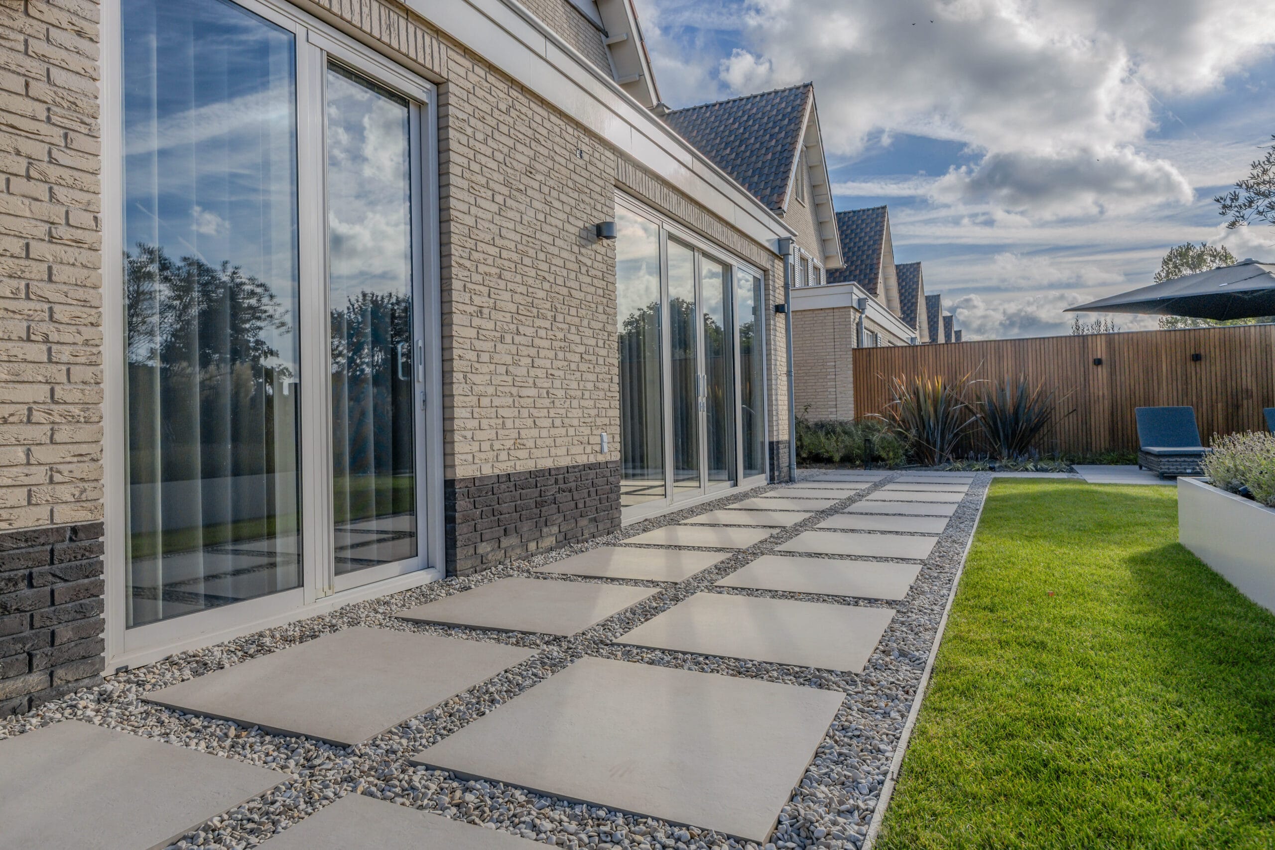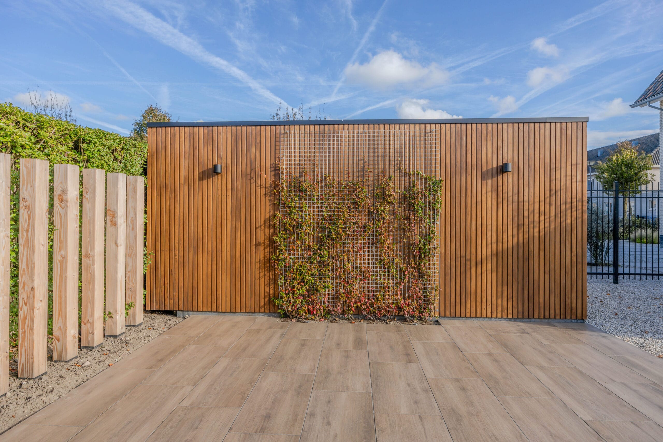 We startten met uitgebreid grondwerk en het realiseren van de betonvloer voor de oprit. Vervolgens werd de tuin stap voor stap opgebouwd: het plaatsen van de veranda met glazen schuifdeur, de bouw van de schuur en het plaatsen van de Ayous Rhombus schutting. Daarna legden we de keramische bestrating aan en werkten we de tuin verder af met beplanting, gras, verlichting en een damwand aan de achterzijde. De Douglas palen van 14×14 cm zorgen voor een stoere, duurzame afscheiding.