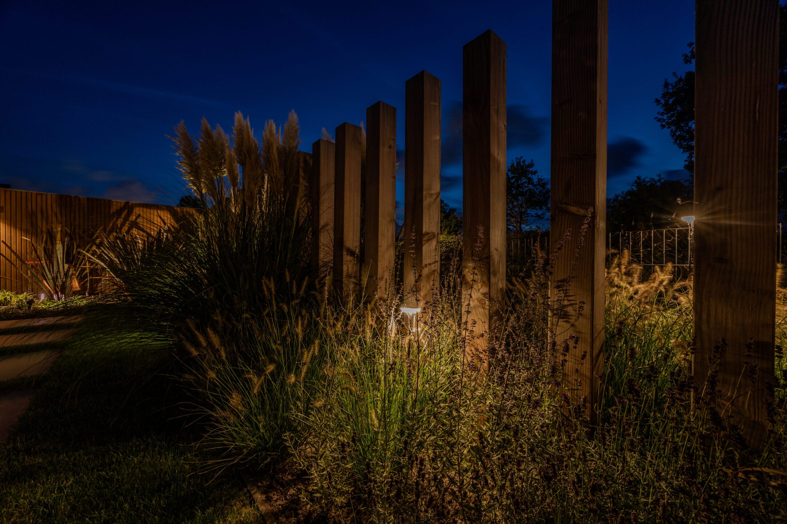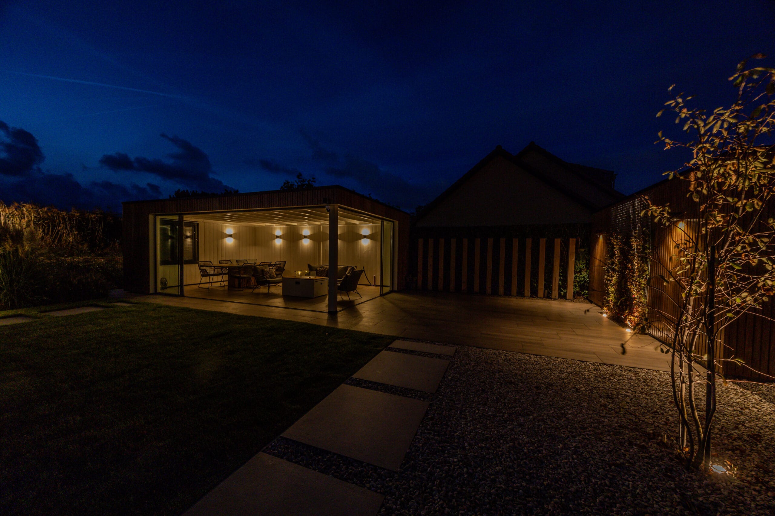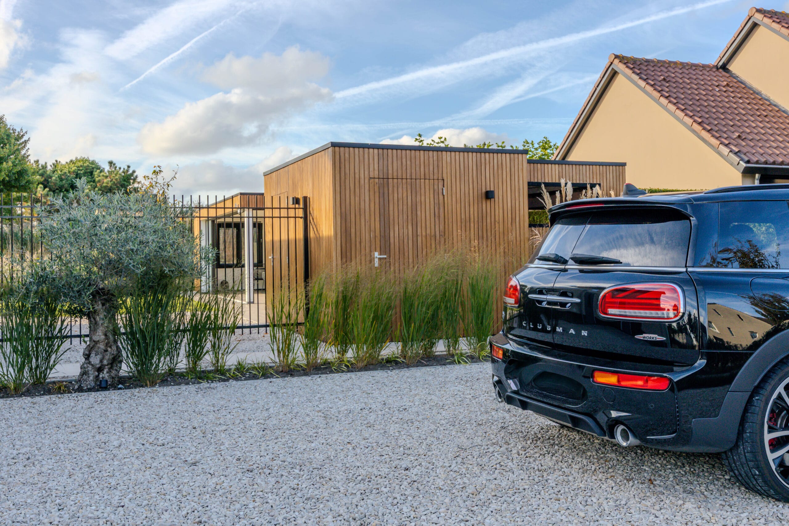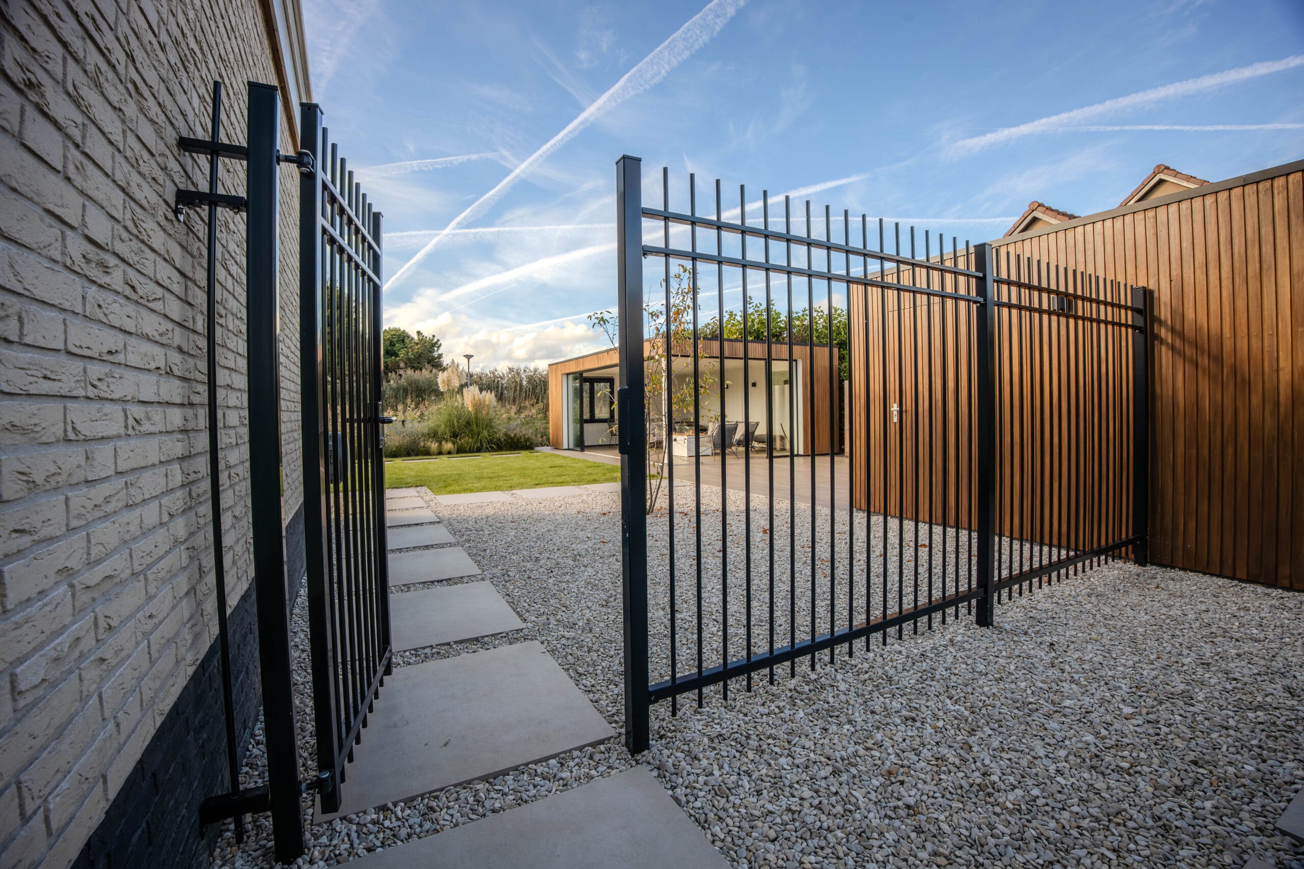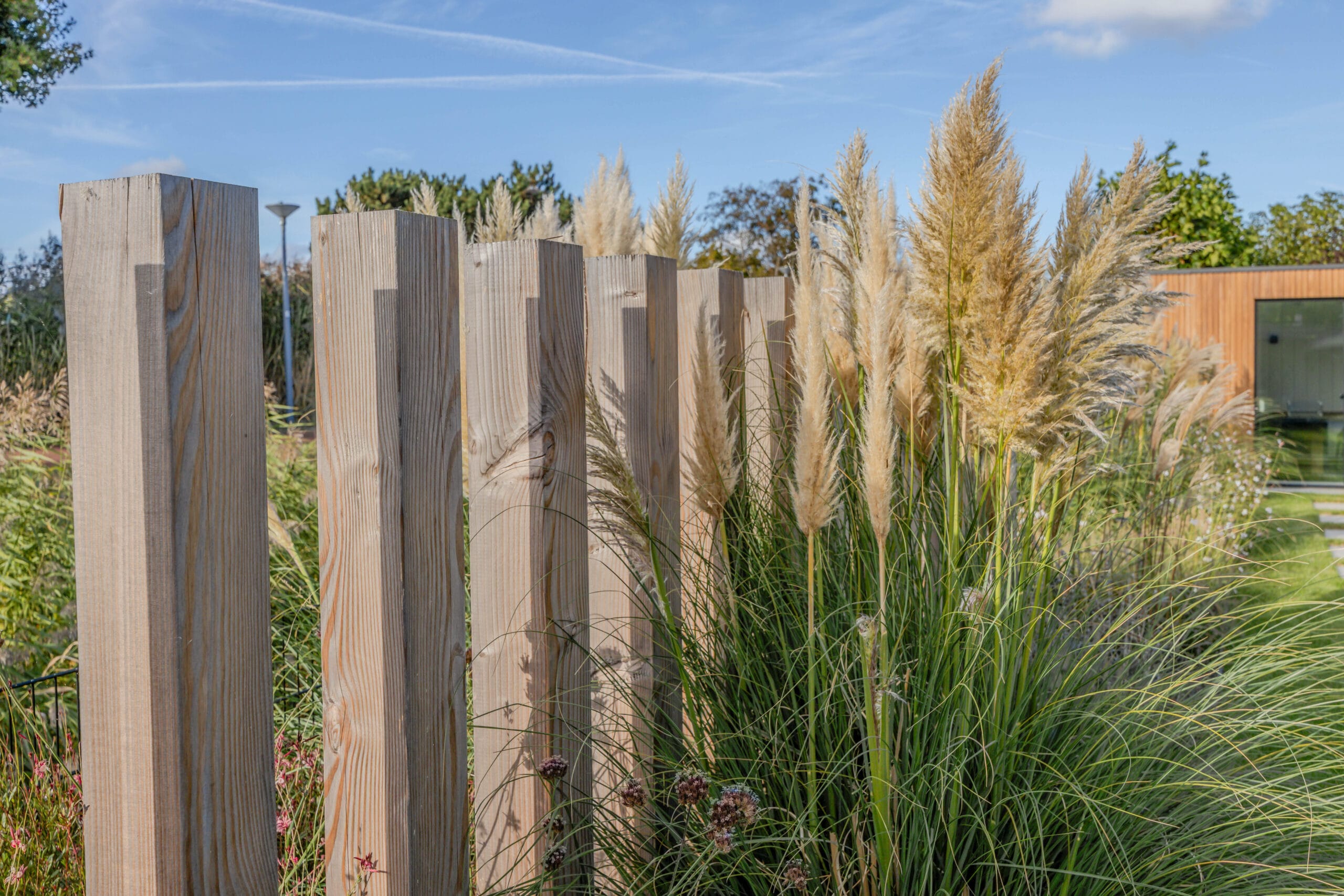We startten met uitgebreid grondwerk en het realiseren van de betonvloer voor de oprit. Vervolgens werd de tuin stap voor stap opgebouwd: het plaatsen van de veranda met glazen schuifdeur, de bouw van de schuur en het plaatsen van de Ayous Rhombus schutting. Daarna legden we de keramische bestrating aan en werkten we de tuin verder af met beplanting, gras, verlichting en een damwand aan de achterzijde. De Douglas palen van 14×14 cm zorgen voor een stoere, duurzame afscheiding.