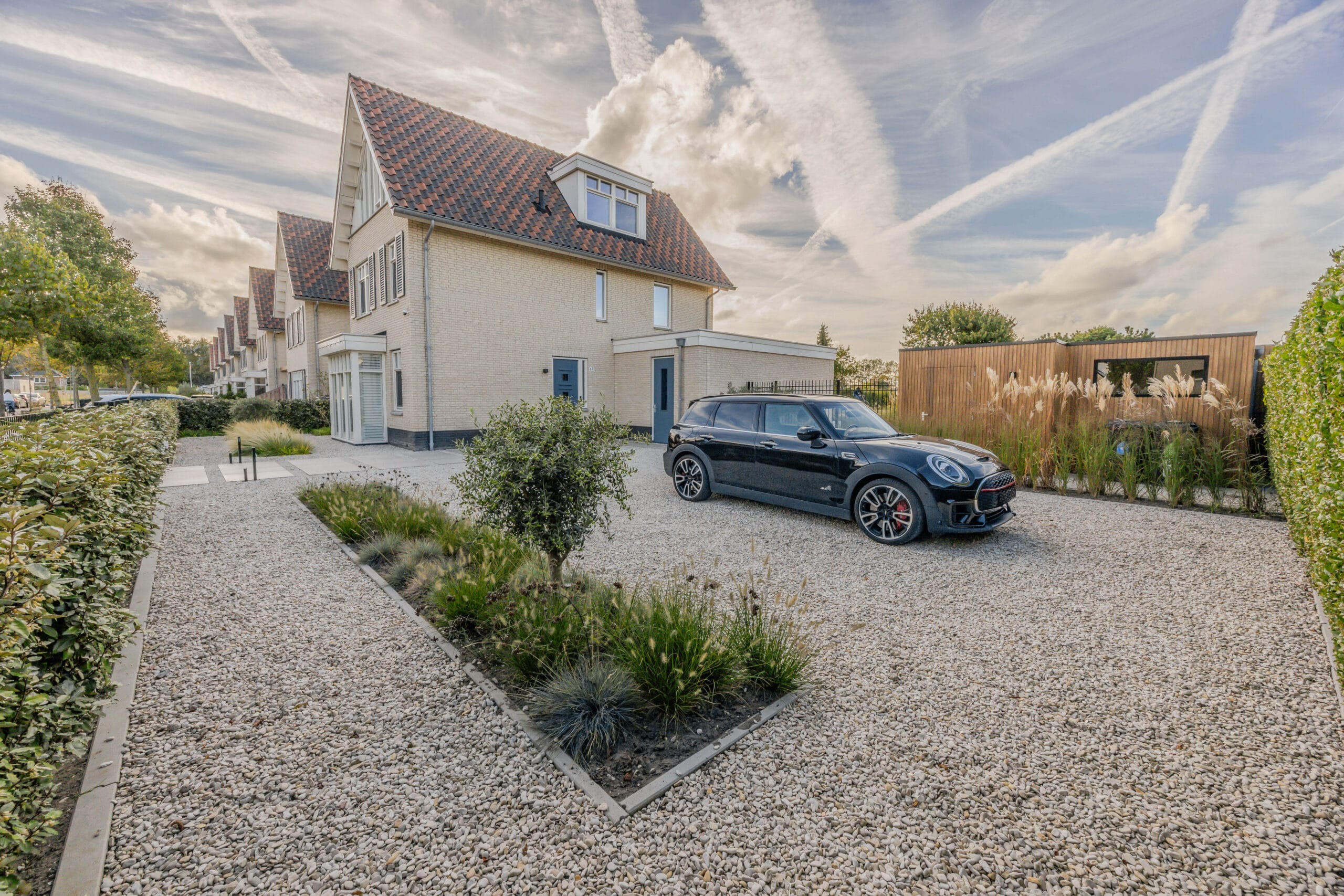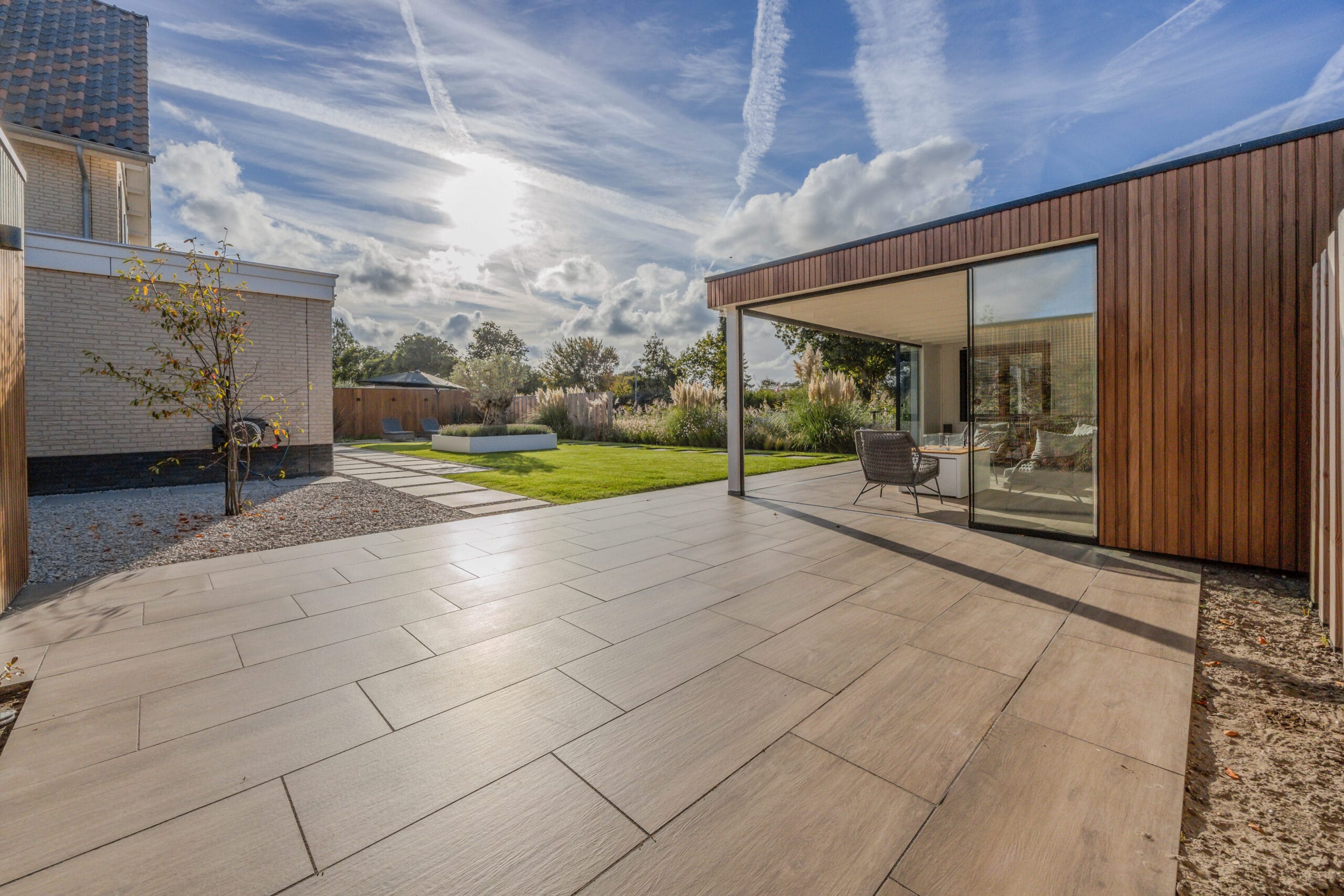 De bewoners wilden een tuin waarin zowel functionaliteit als uitstraling samenkomen. De wens: een ruime veranda, een nieuwe schuur, een natuurlijke erfafscheiding, strakke bestrating, voldoende groen en ruimte voor opslag. Daarnaast moest de tuin duurzaam zijn en passen bij de stijl van de woning.