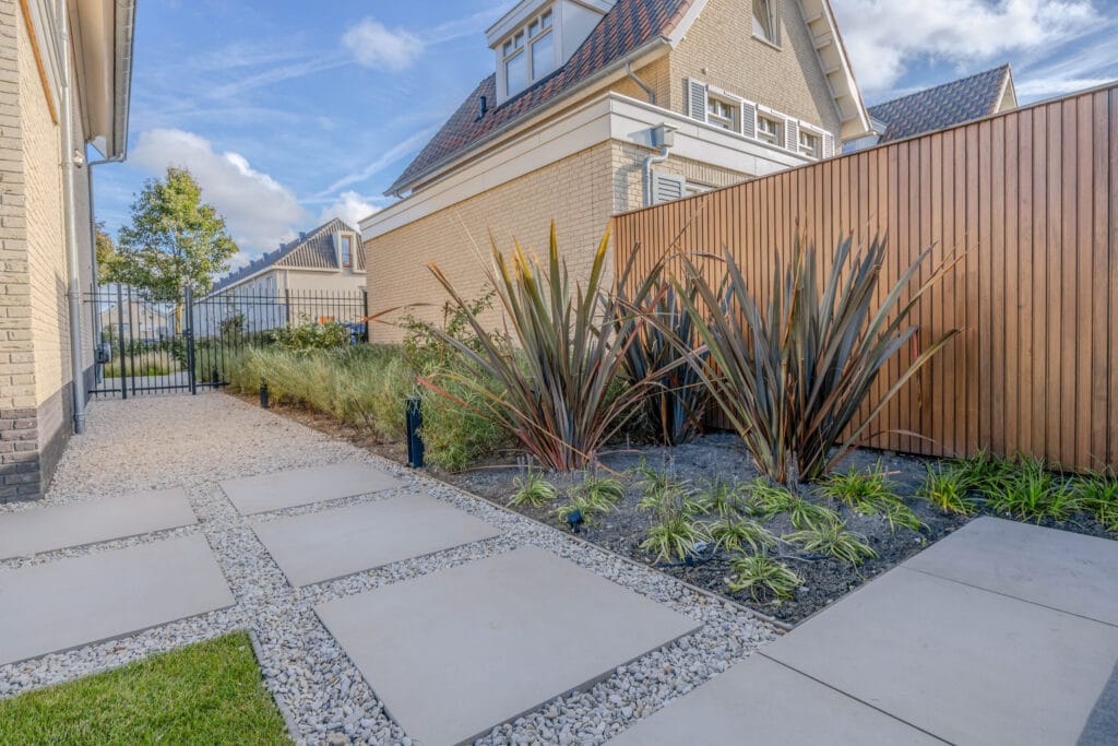 In Hoek van Holland ontwierpen en realiseerden we een complete tuinrenovatie waarin natuurlijke materialen, praktische indeling en een warme uitstraling centraal staan. Het resultaat is een tuin met karakter, veel leefruimte en hoogwaardige details.
