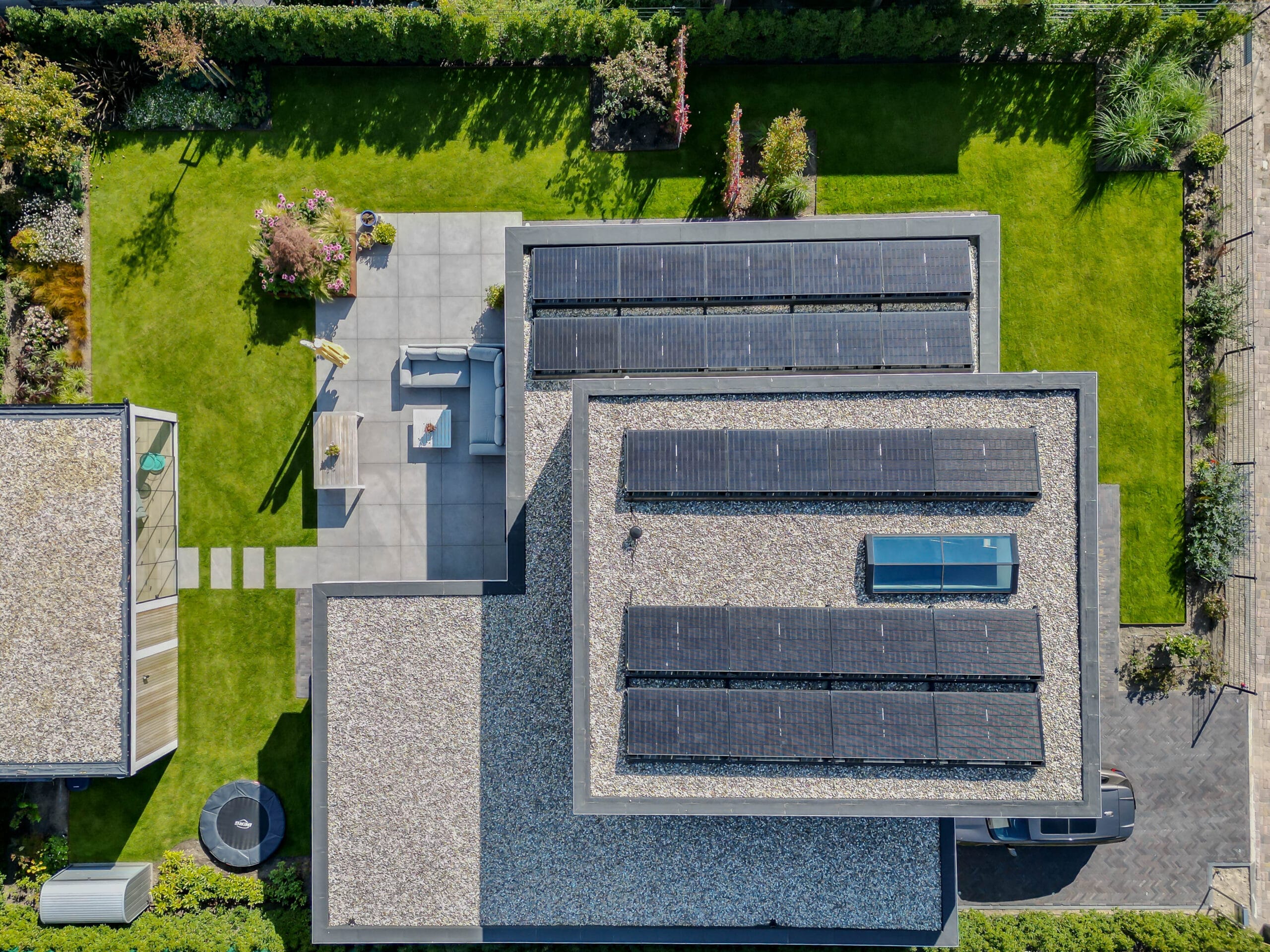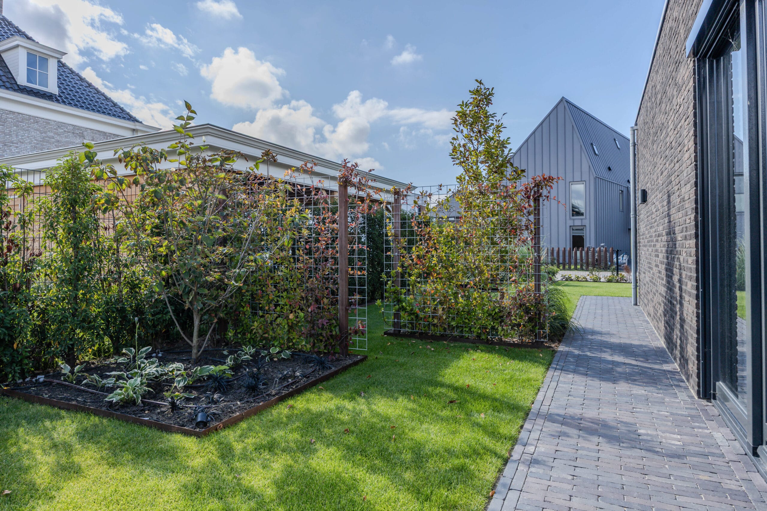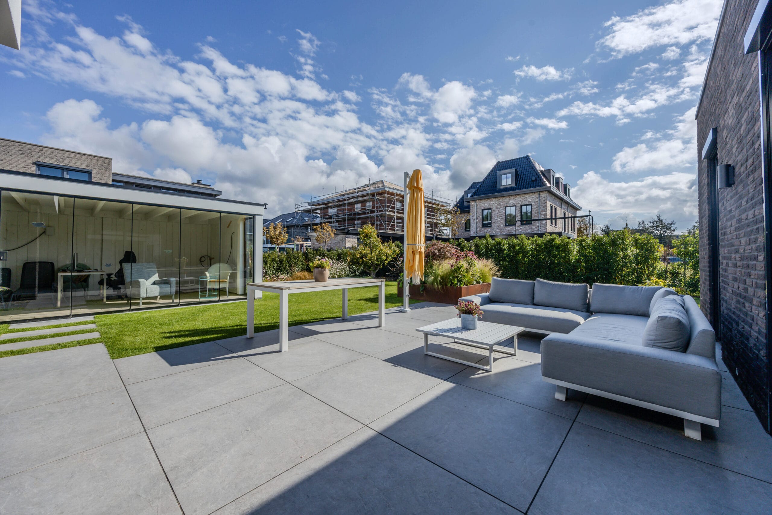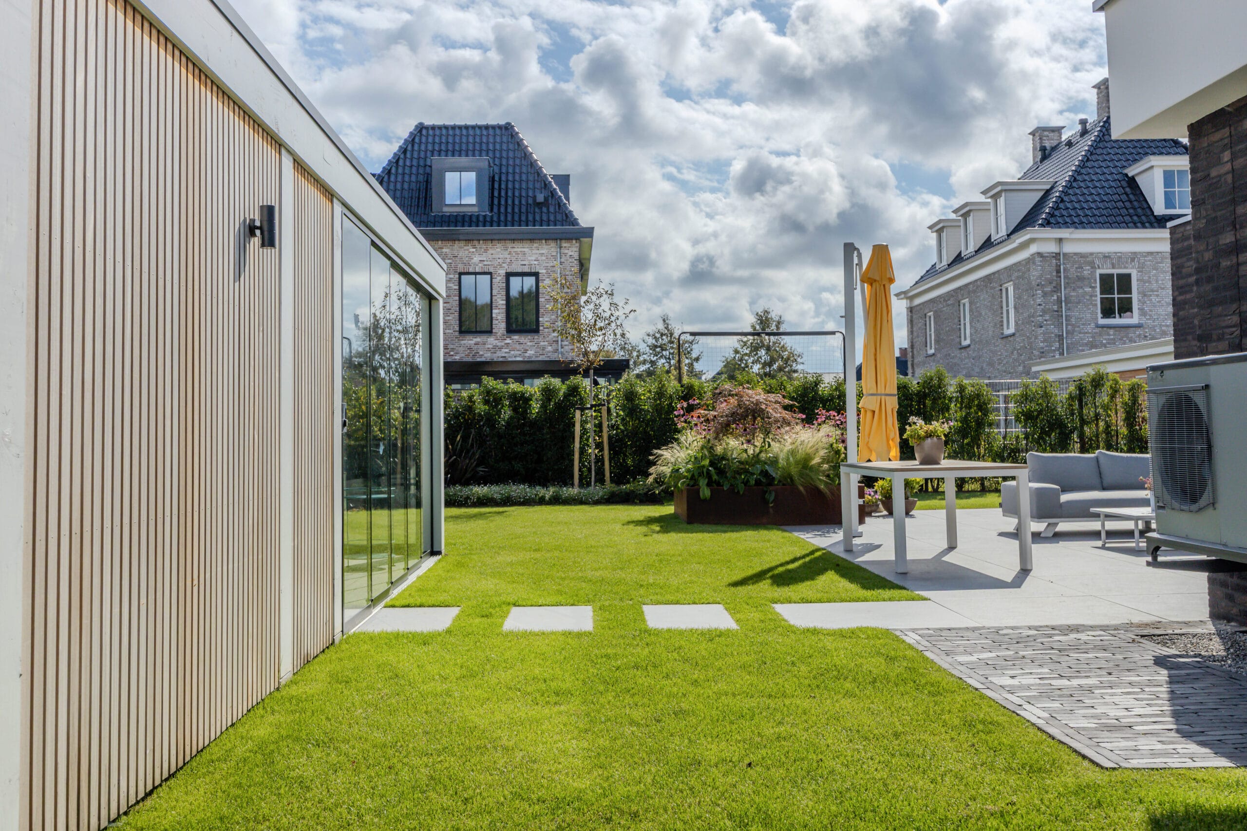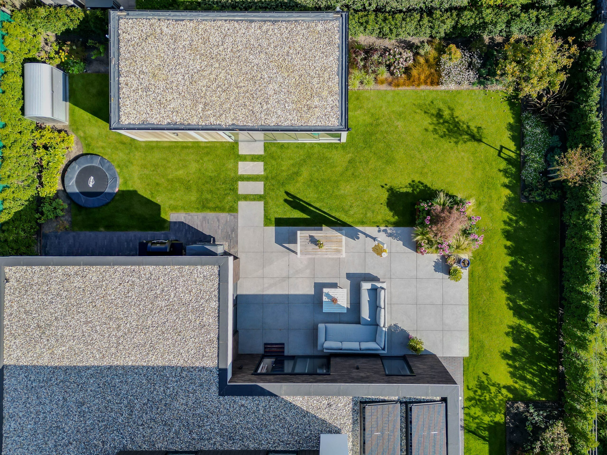 De bewoners wilden een onderhoudsvriendelijke tuin waarin het hele gezin zich thuis voelt: met ruimte om te ontspannen, te spelen en te genieten. Belangrijke wensen waren een robuuste veranda met glazen schuifwanden, een veilige speelplek met trampoline, een strakke oprit én voldoende groen om de tuin warm en levendig te houden.