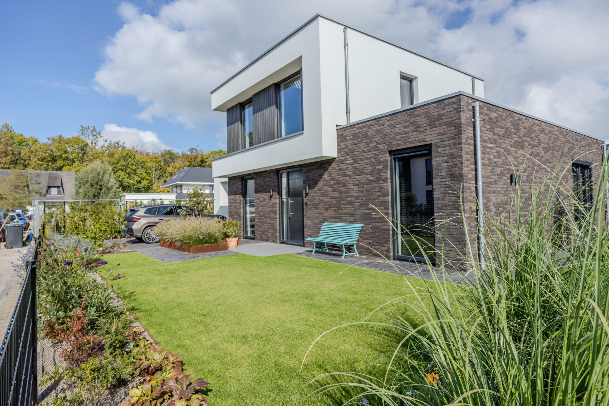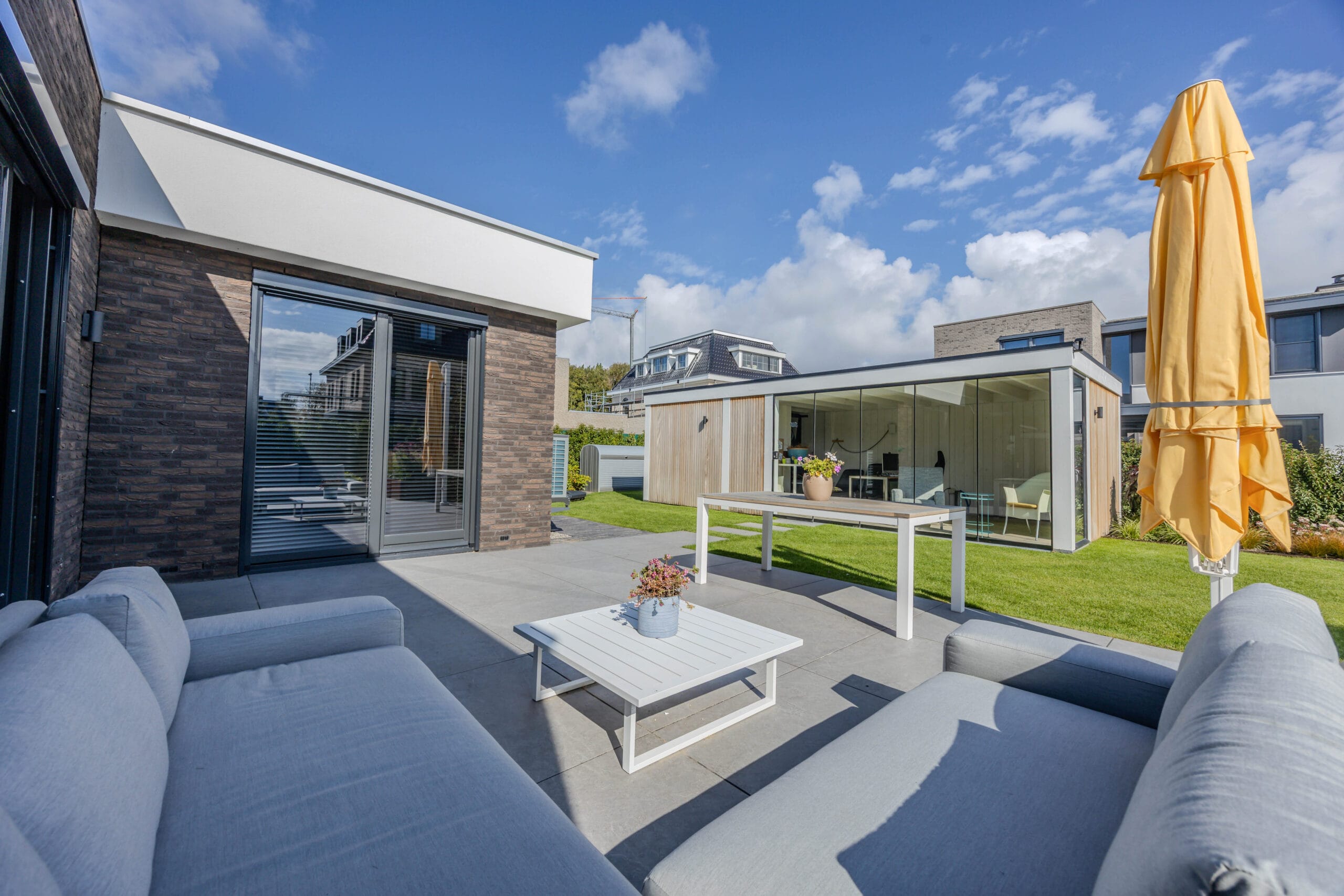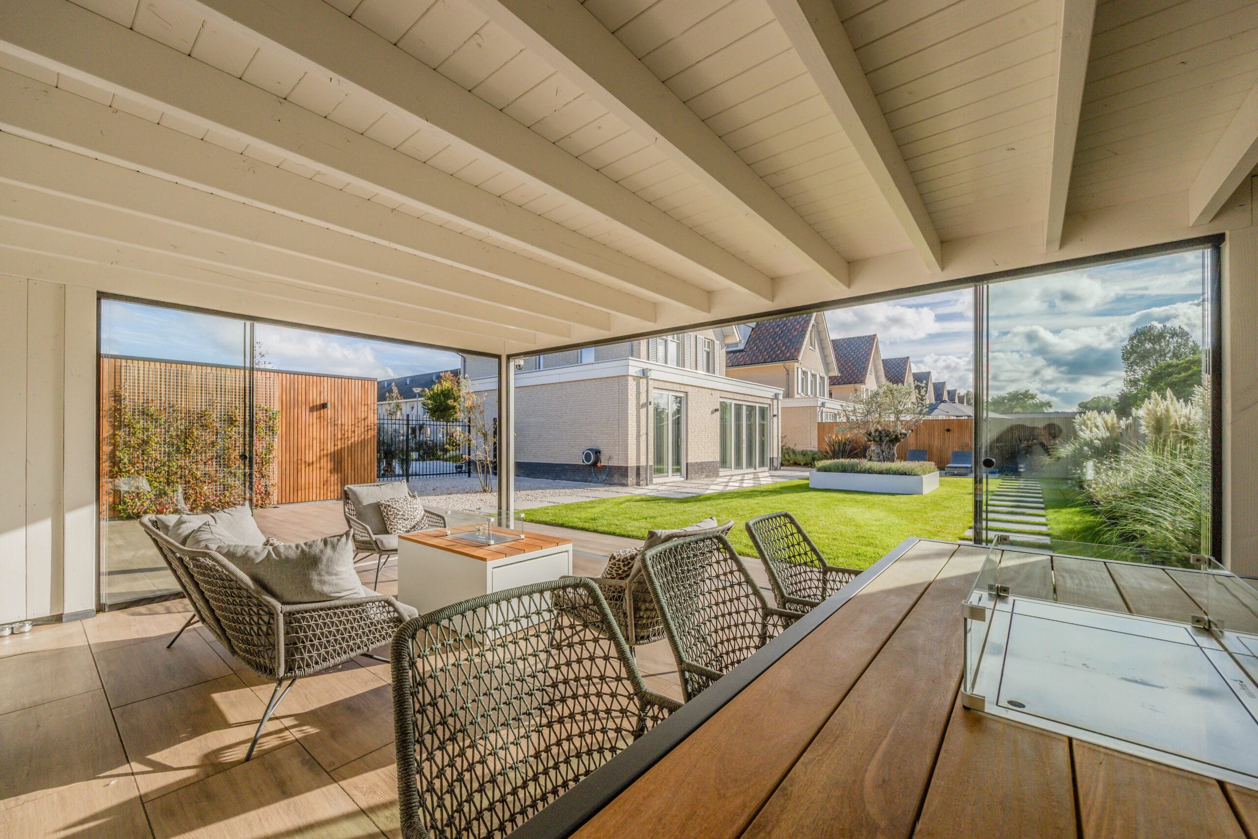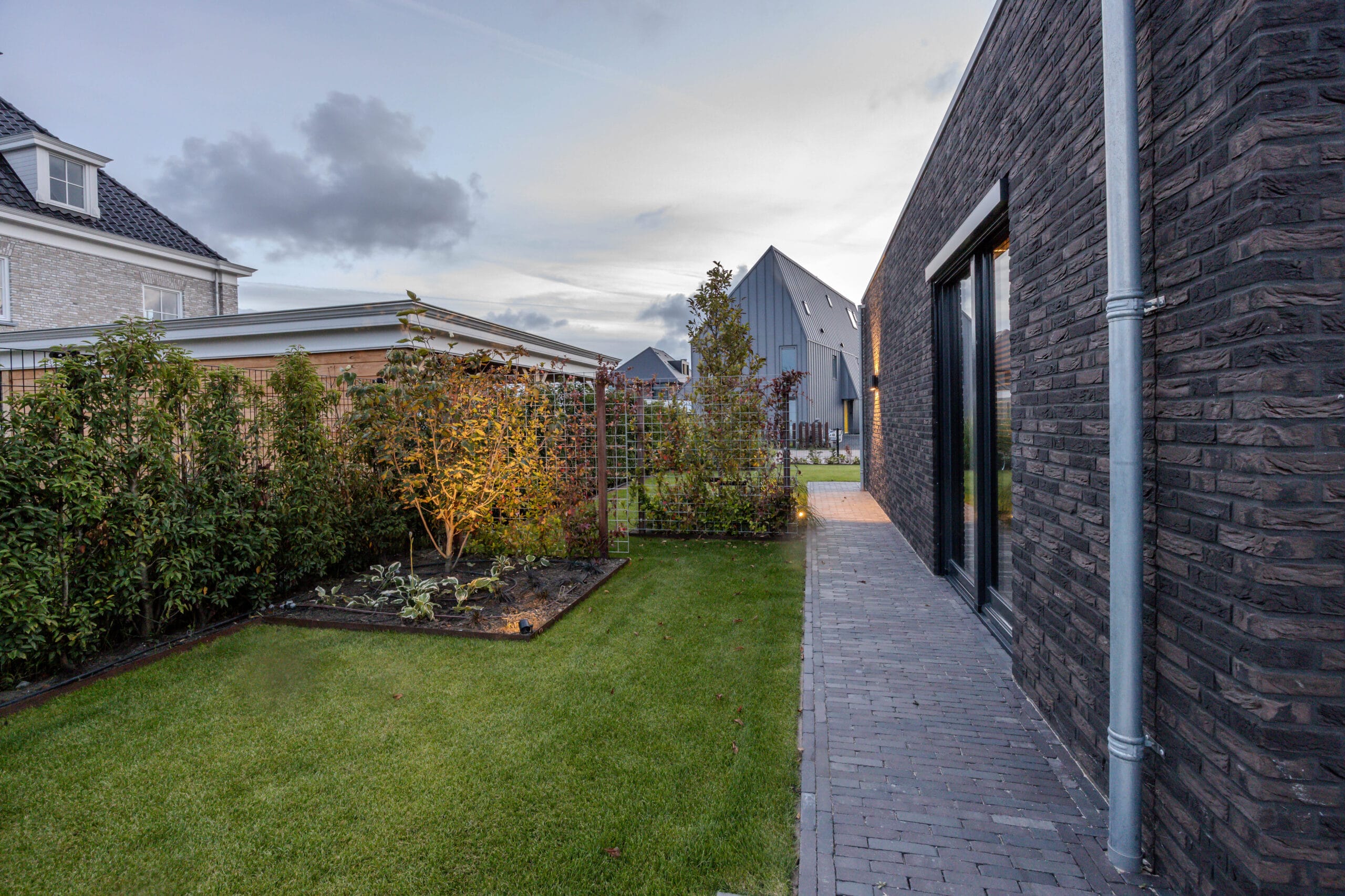 De bewoners wilden een onderhoudsvriendelijke tuin waarin het hele gezin zich thuis voelt: met ruimte om te ontspannen, te spelen en te genieten. Belangrijke wensen waren een robuuste veranda met glazen schuifwanden, een veilige speelplek met trampoline, een strakke oprit én voldoende groen om de tuin warm en levendig te houden.
