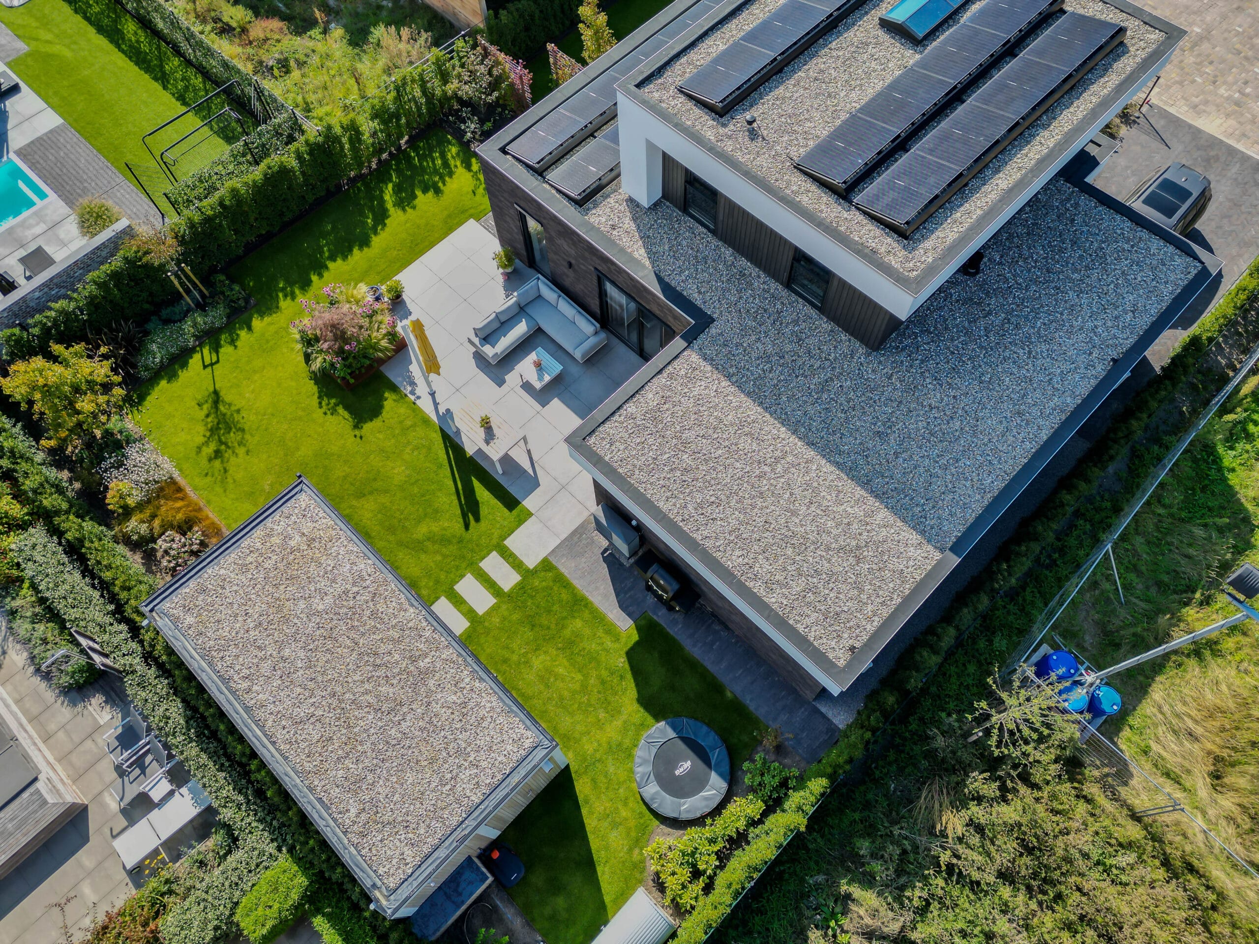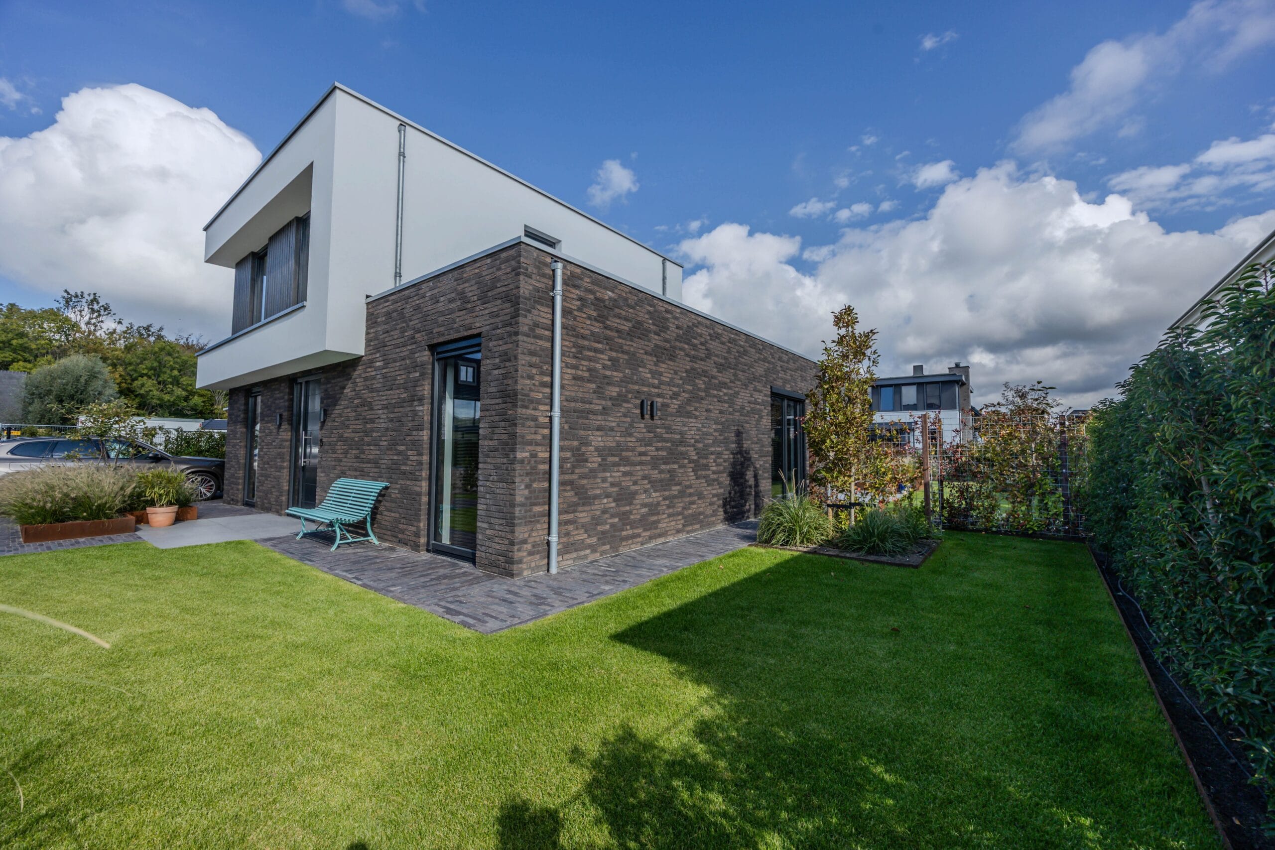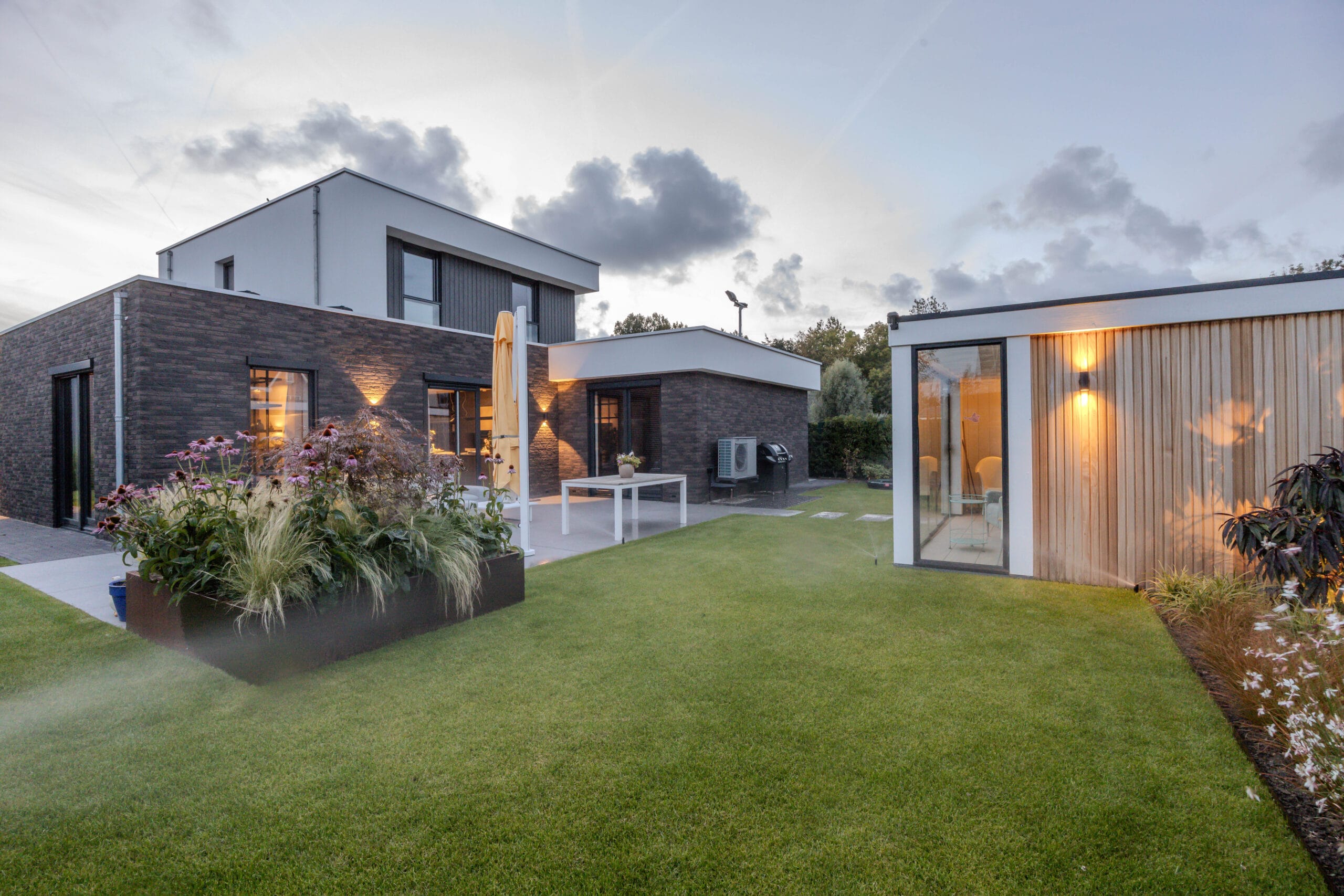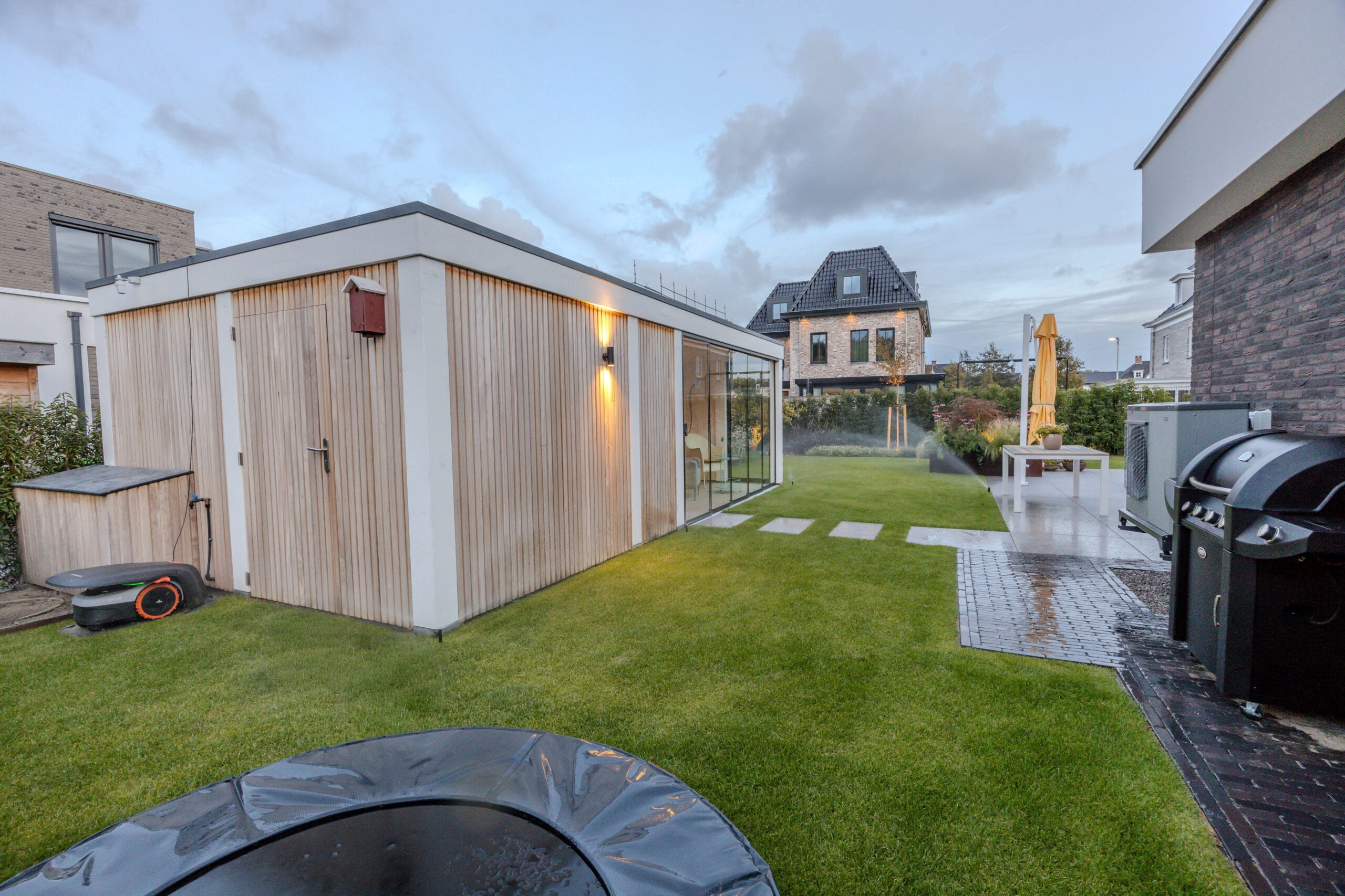 De veranda werd voorzien van glazen schuifdeuren zodat deze het hele jaar bruikbaar is. We kozen voor keramische tegels in het terras en gebakken materiaal voor de oprit: duurzaam en stijlvol. Op maat gemaakte cortenstalen plantenbakken vormen de rode draad in het ontwerp en geven structuur. De tuin is volledig uitgerust met In-lite verlichting en automatische beregening, waardoor sfeer en onderhoud optimaal worden ondersteund. Het hekwerk en de trampoline maken het geheel compleet.