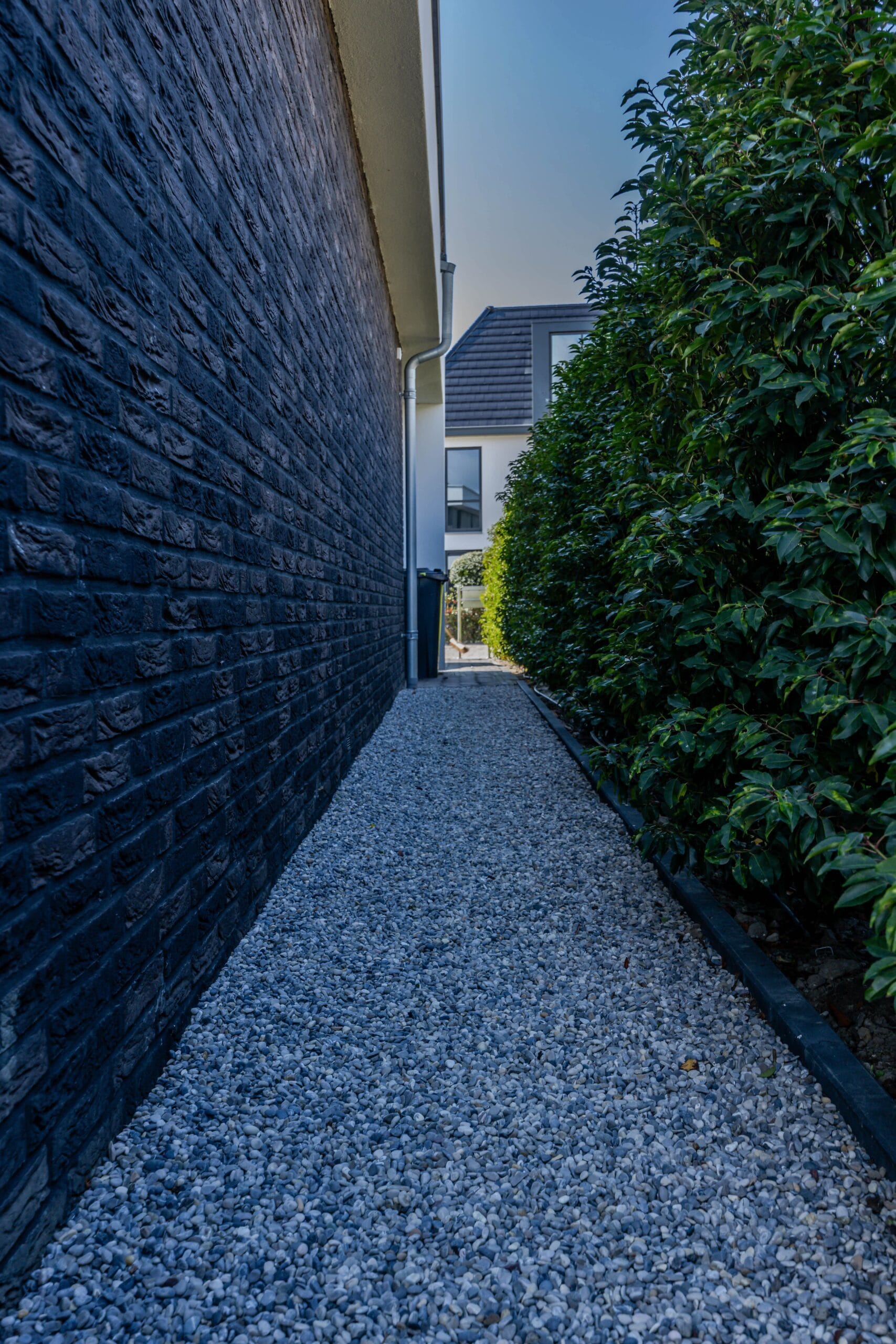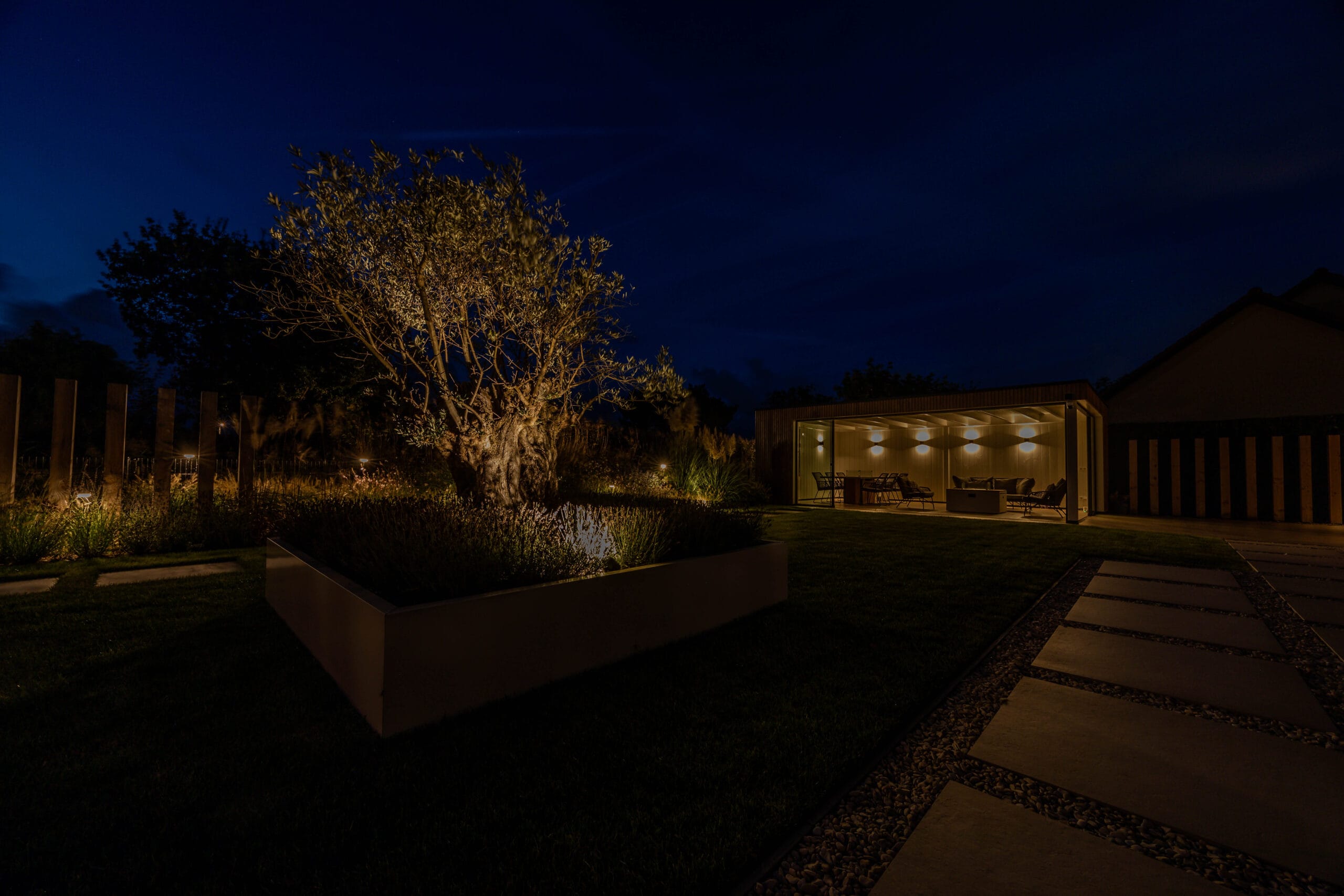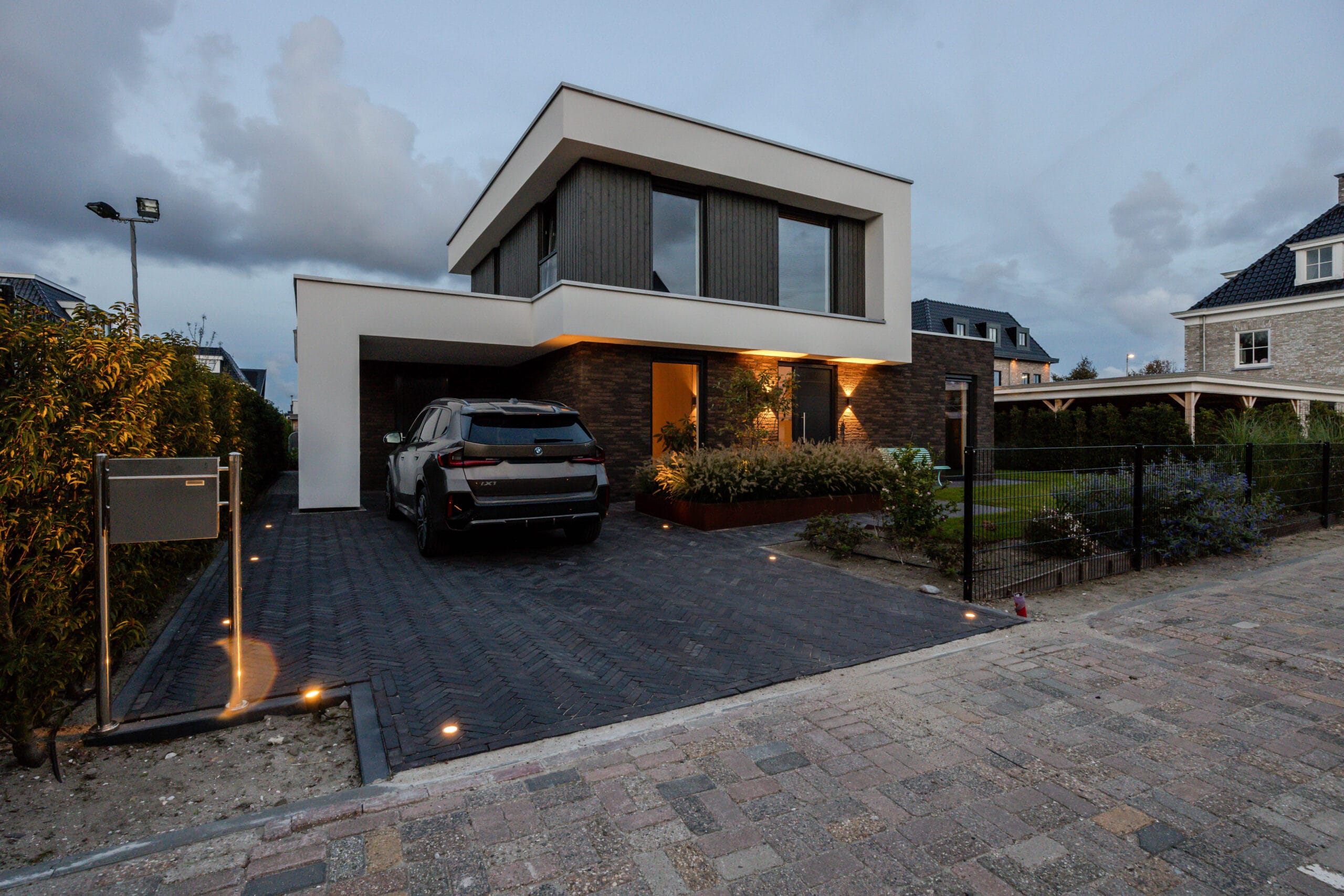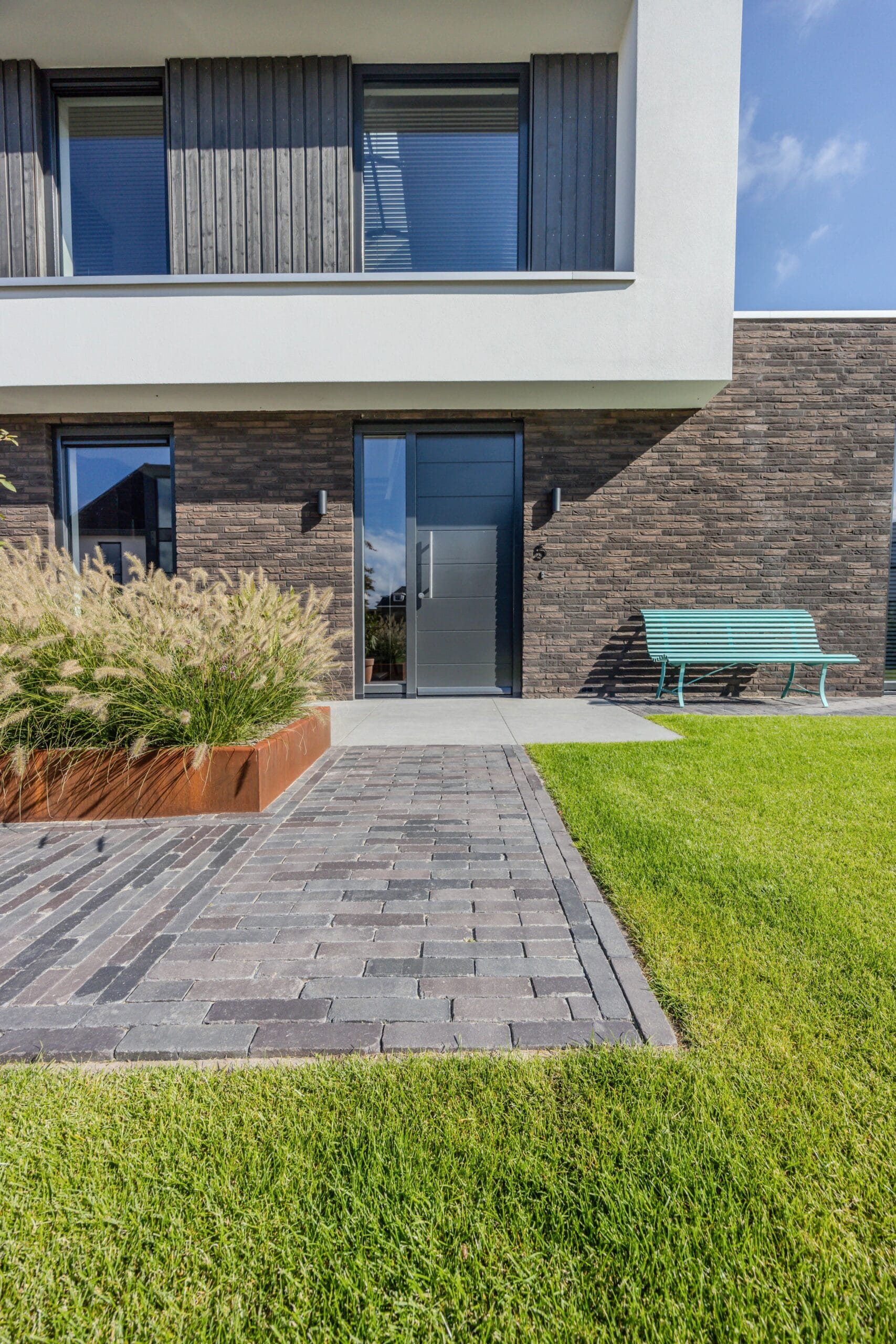 De veranda werd voorzien van glazen schuifdeuren zodat deze het hele jaar bruikbaar is. We kozen voor keramische tegels in het terras en gebakken materiaal voor de oprit: duurzaam en stijlvol. Op maat gemaakte cortenstalen plantenbakken vormen de rode draad in het ontwerp en geven structuur. De tuin is volledig uitgerust met In-lite verlichting en automatische beregening, waardoor sfeer en onderhoud optimaal worden ondersteund. Het hekwerk en de trampoline maken het geheel compleet.