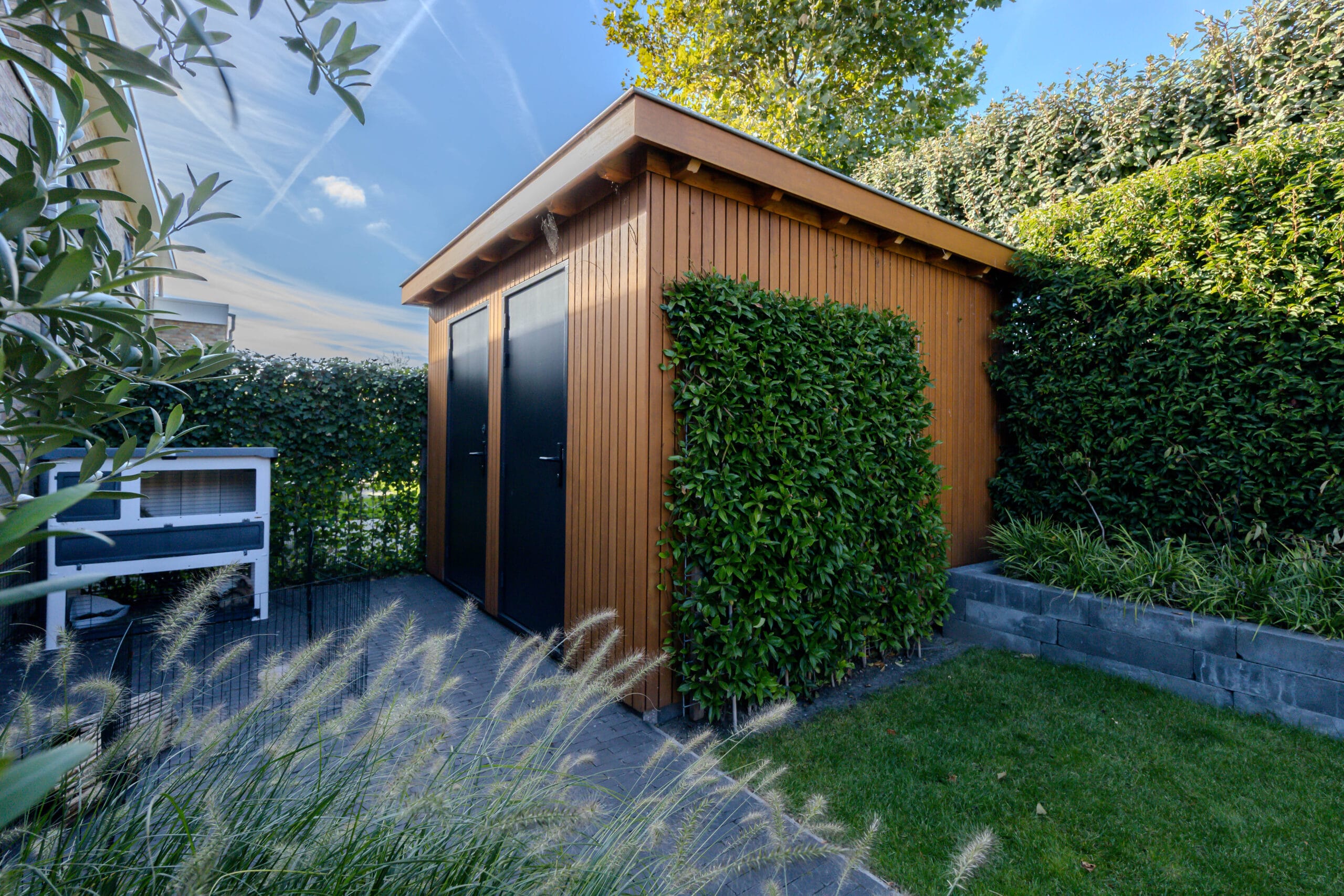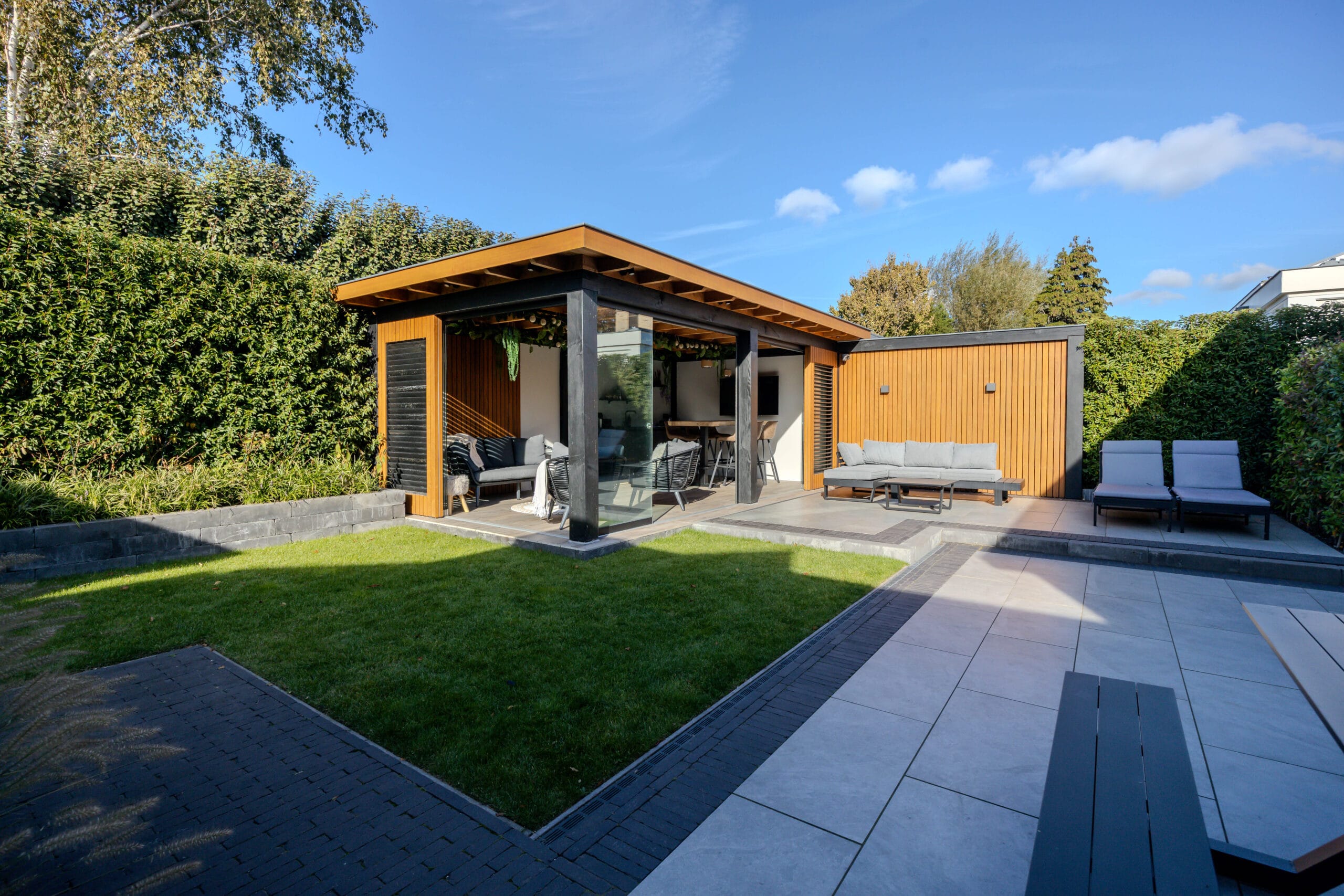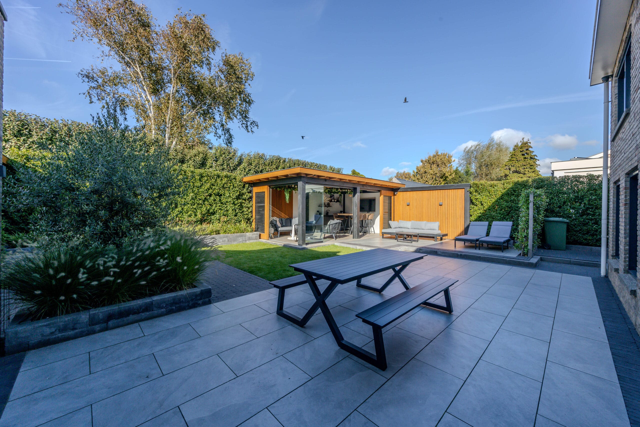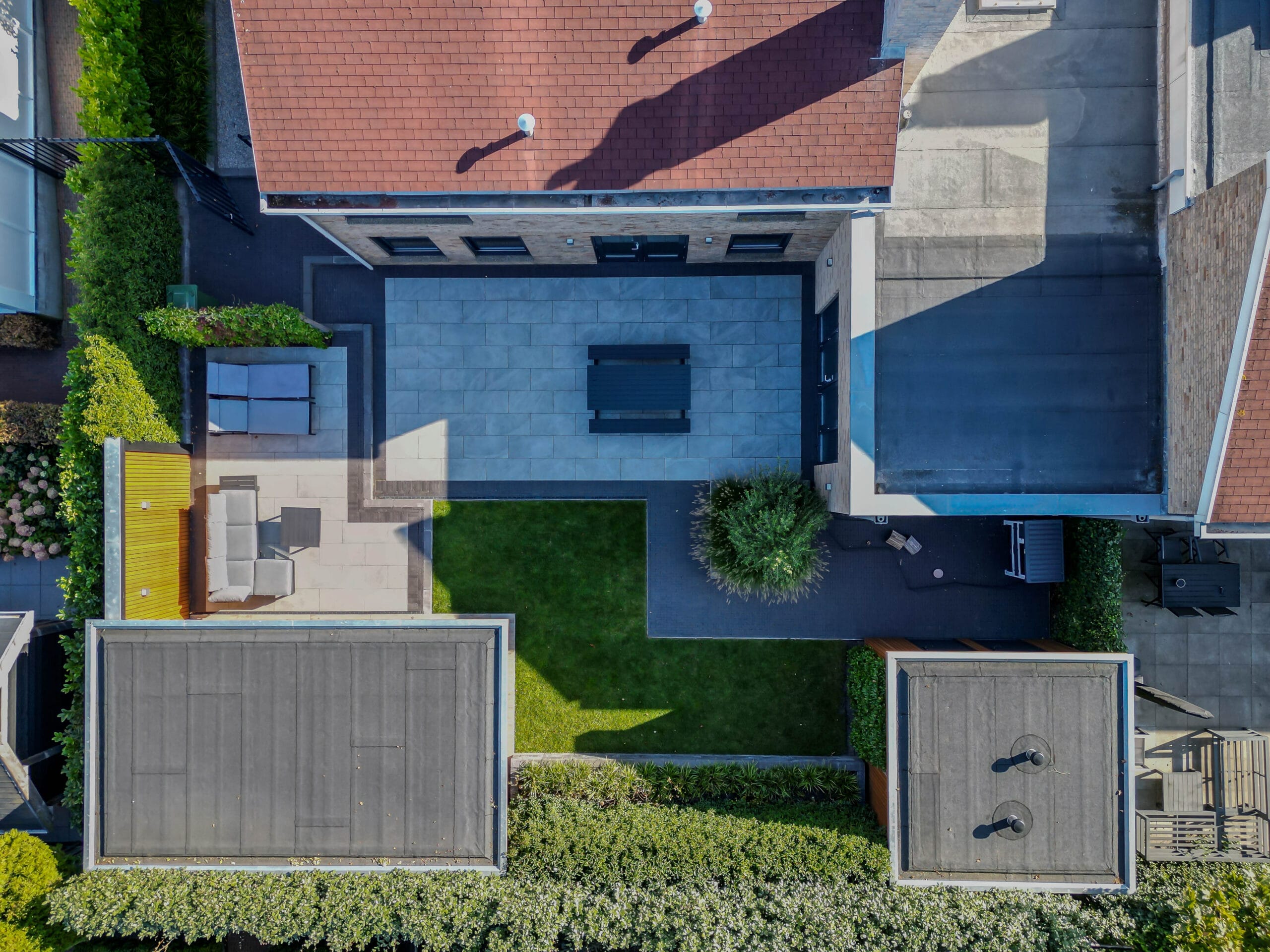 De tuin bestaat uit rustige lijnen, hoogwaardige materialen en slimme functies. De keramische tegels zorgen voor een strak en onderhoudsarm terras, terwijl gebakken materiaal warmte toevoegt in looppaden en traptredes. De veranda met glazen schuifwanden vormt een beschutte plek om het hele jaar door te genieten. De betonnen plantenbak geeft structuur en verbindt de niveauverschillen. De leibomen creëren privacy zonder de tuin te zwaar te maken. Dankzij In-lite verlichting en beregening is de tuin zowel praktisch als sfeervol in elk seizoen.