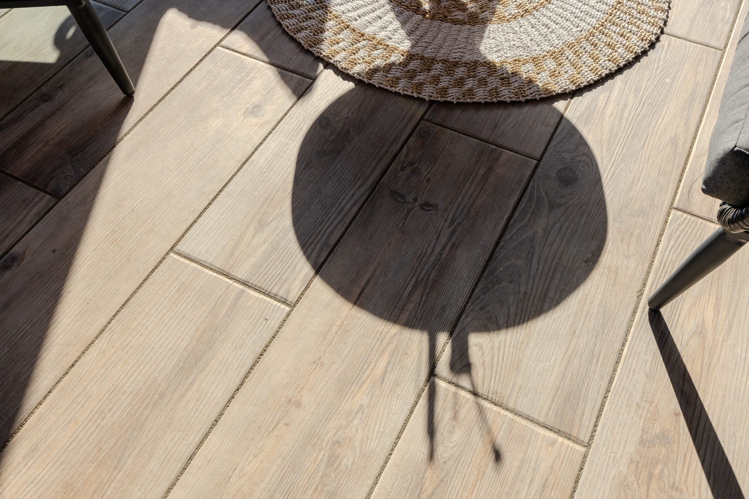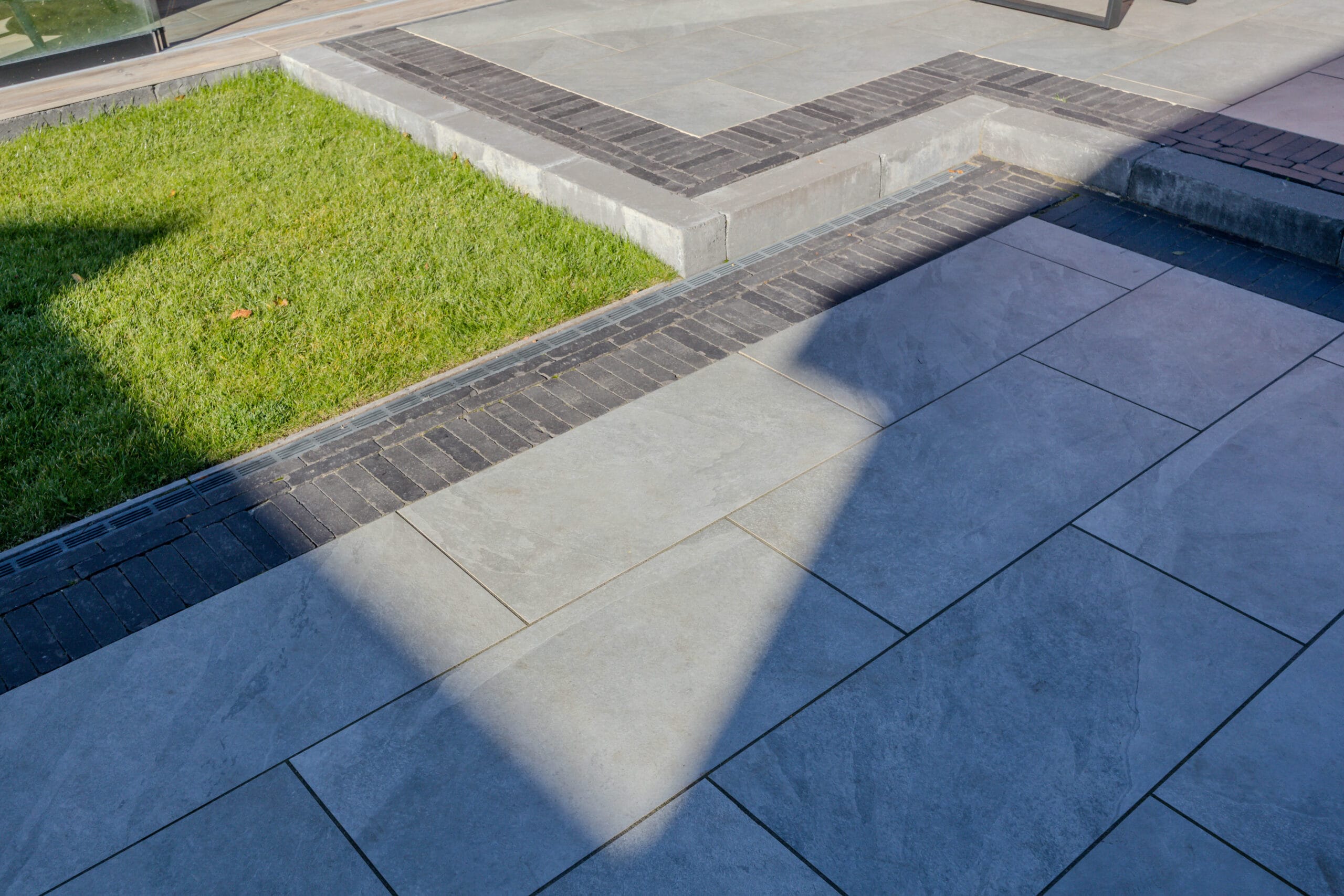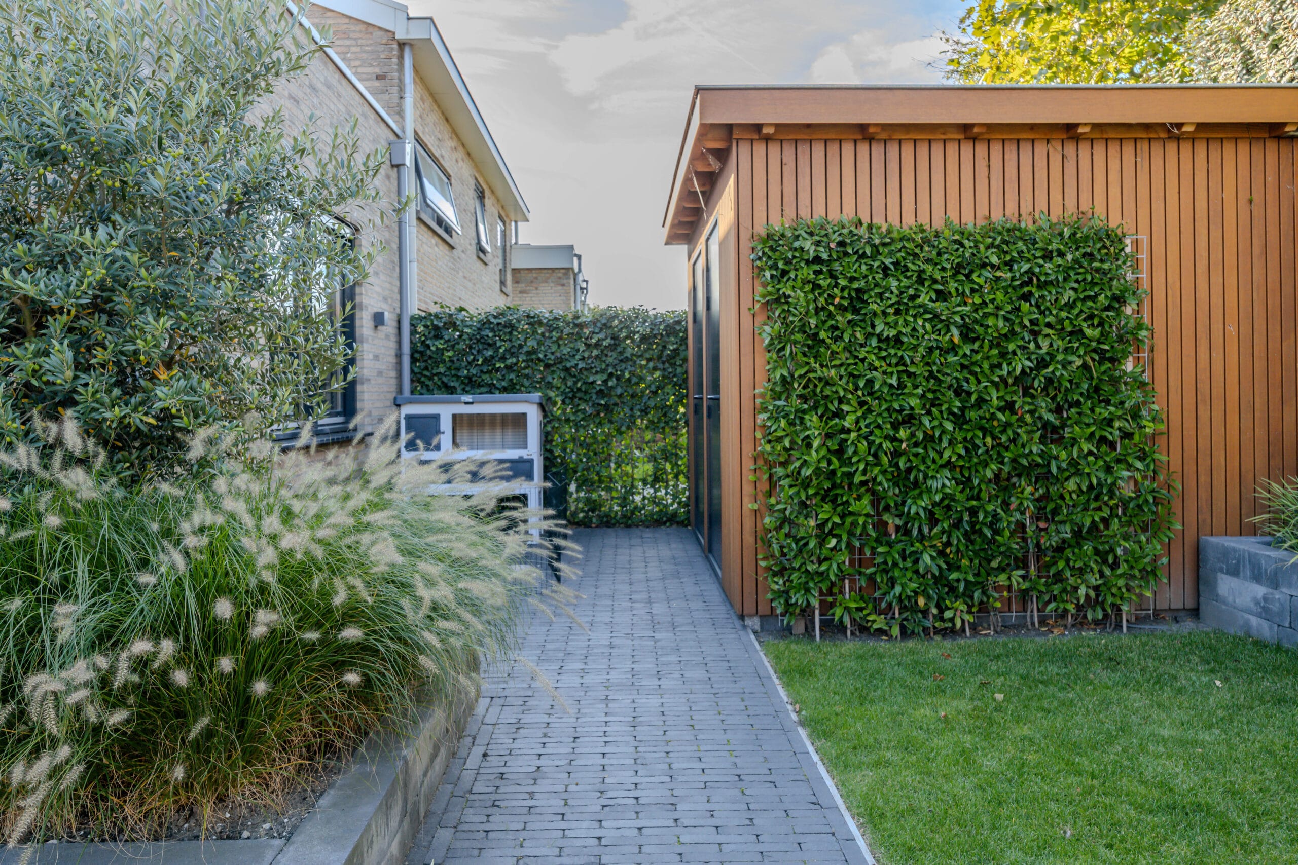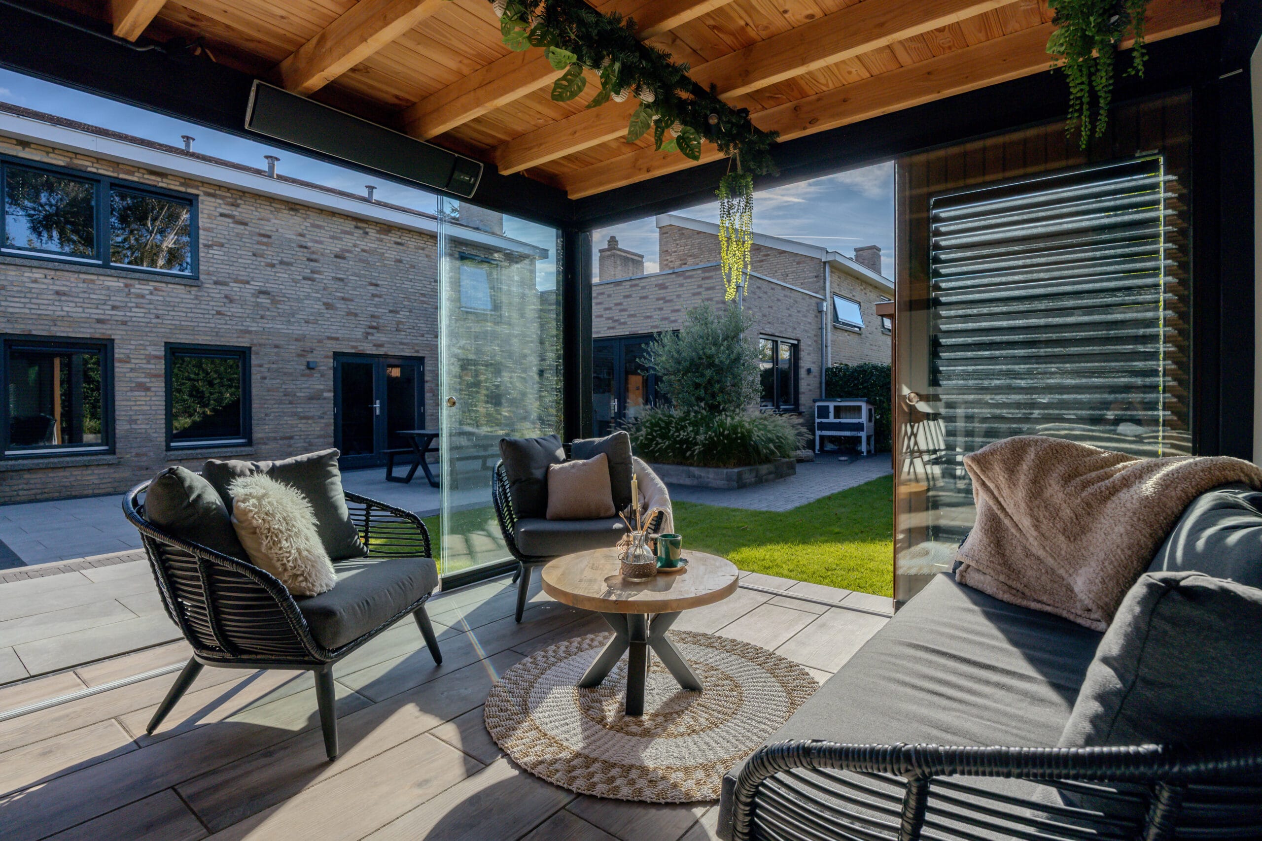 De tuin bestaat uit rustige lijnen, hoogwaardige materialen en slimme functies. De keramische tegels zorgen voor een strak en onderhoudsarm terras, terwijl gebakken materiaal warmte toevoegt in looppaden en traptredes. De veranda met glazen schuifwanden vormt een beschutte plek om het hele jaar door te genieten. De betonnen plantenbak geeft structuur en verbindt de niveauverschillen. De leibomen creëren privacy zonder de tuin te zwaar te maken. Dankzij In-lite verlichting en beregening is de tuin zowel praktisch als sfeervol in elk seizoen.